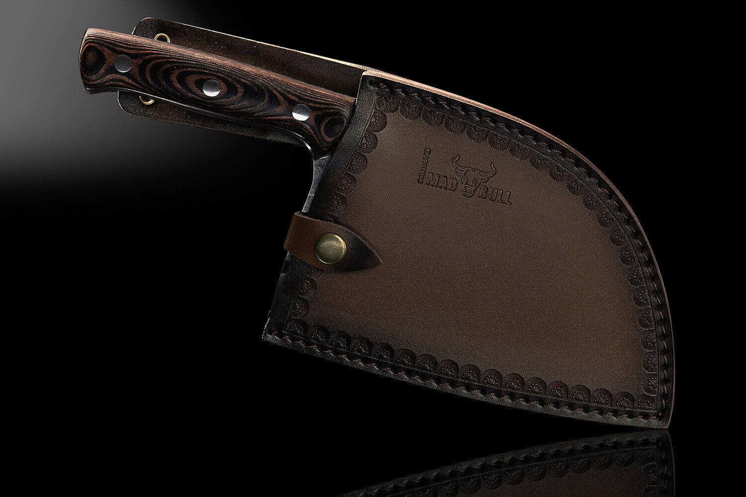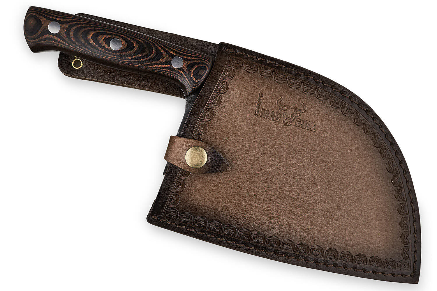 Pour protéger et sécuriser votre lame, elle est accompagnée d'une gaine en cuir marron au design traditionnel, ornée du logo de la marque gravé.