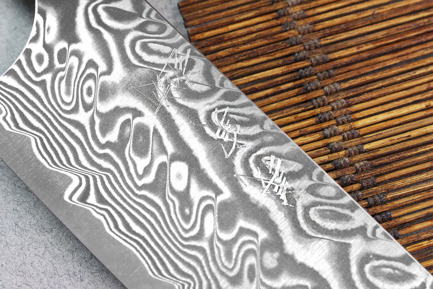 Le cœur est ensuite entouré de plusieurs couches d'aciers différents : c'est le procédé du damasquinage. En effet, un couteau damassé est un couteau sur lequel on a replié des tranches d'aciers les unes par dessus les autres. Ici, Kato utilise un acier inoxydable doux, et un acier au nickel. C'est la variation des aciers qui crée les vagues uniques ondulant sur la surface de coupe. L'acier inoxydable a l'avantage d'augmenter la résistance à la corrosion, tandis que l'acier au nickel va donner une meilleure résistance mécanique. Le mélange des deux tons donne au couteau un côté tout à fait surprenant. C'est une pièce unique, son originalité étant accentuée par les "rayures" ayant été appliquées par dessus la superposition des aciers. Cela crée de magnifiques ondulations métalliques, un peu comme le ferait votre doigt qui viendrait troubler la surface de l'eau qui dort.
