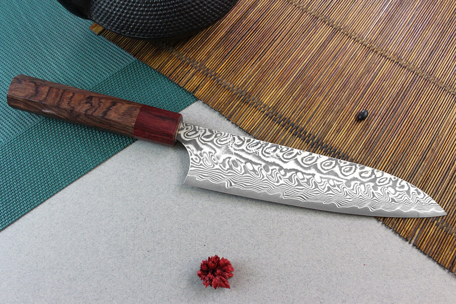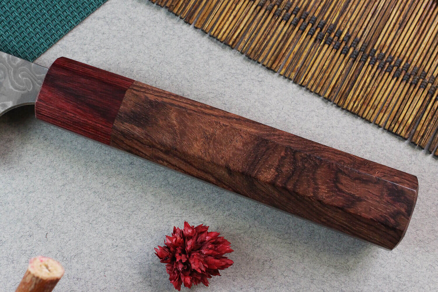 Le manche est réalisé en Sandalwood, un bois à grains fins agréable et léger en main. Sa forme octogonale vient épouser la forme de votre paume, pour un contrôle marqué du couteau lors de vos usages. Une mitre en Pakkawood rouge (un matériau composite antibactérien résistant à l'humidité) vient faire le lien entre la lame et le manche (où vous pouvez même admirer les nœuds du bois selon le modèle). Le tout contraste très bien, et selon la lumière, vous pouvez même remarquer des zones iridescentes au cœur du Pakkawood. Les droitiers comme les gauchers peuvent l'utiliser.
