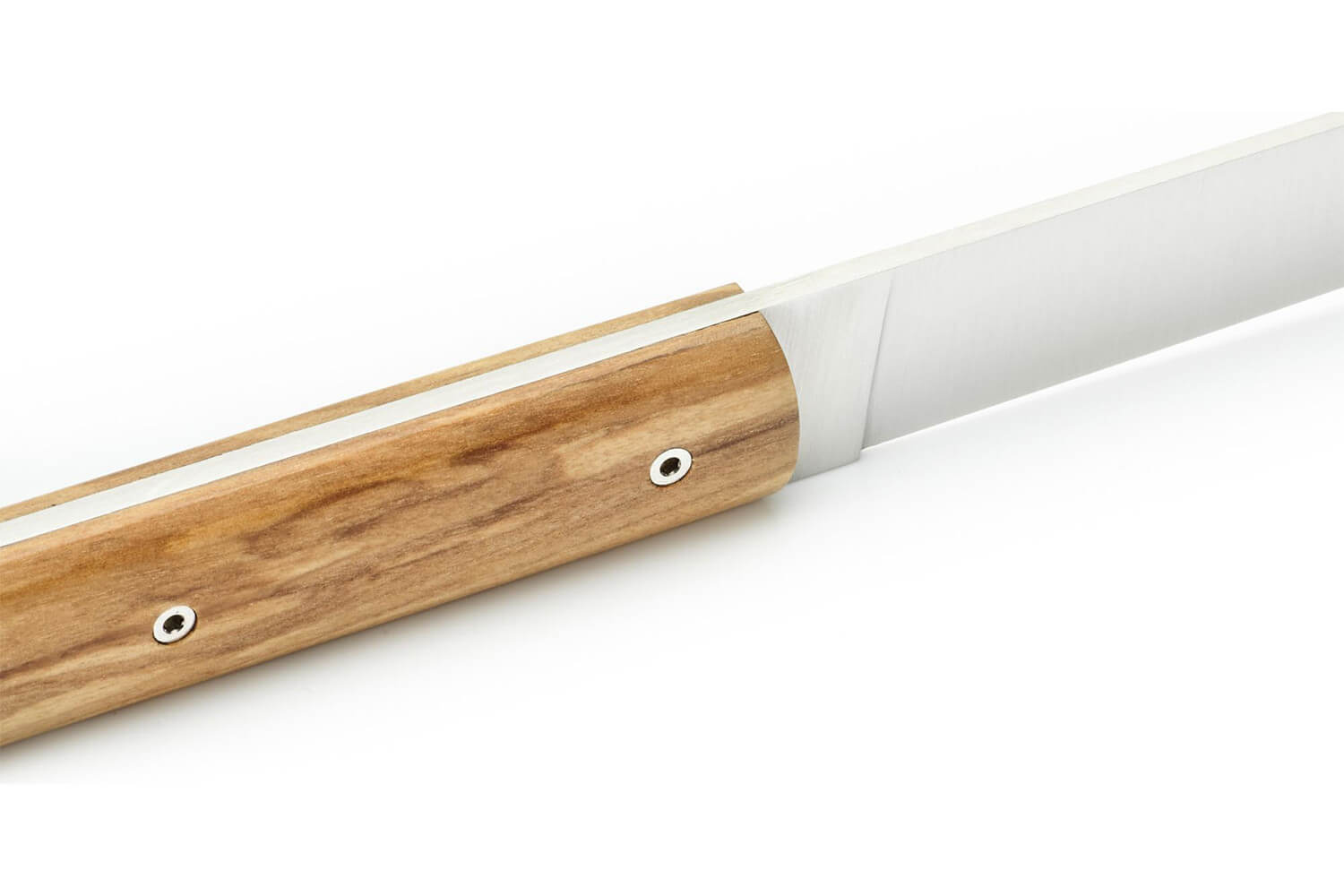 Le manche en bois d’olivier massif est un bijou à lui seul : chaque pièce est unique, avec des veines claires et chaleureuses, pour une prise en main agréable et un rendu visuel sublime. Le montage est effectué avec des vis, ce qui assure une robustesse accrue. Bref, c’est du beau, du solide… et du français !