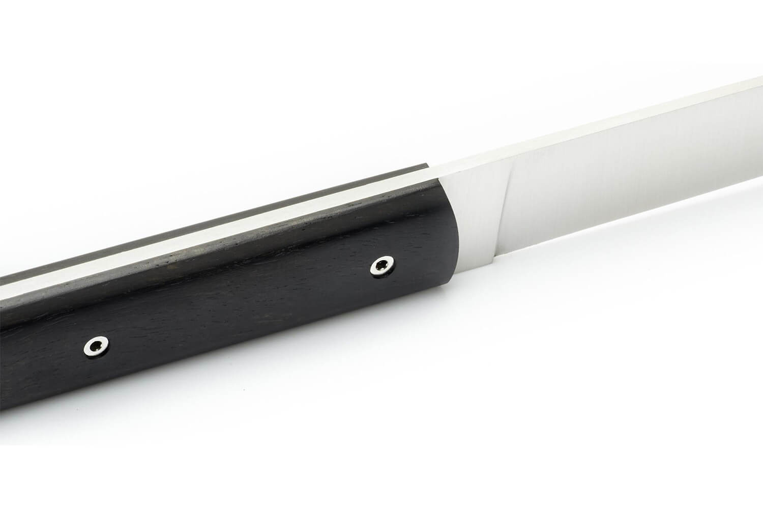 Mais la vraie star ici, c’est le manche en ébène du Gabon. Ce bois exotique dense et sombre donne aux couteaux une touche à la fois sobre et majestueuse. Chaque pièce est unique, avec une finition satinée luxueuse. Montage vissé, affûtage manuel au cuir de buffle, et polissage à la main complètent ces couteaux français haut de gamme.