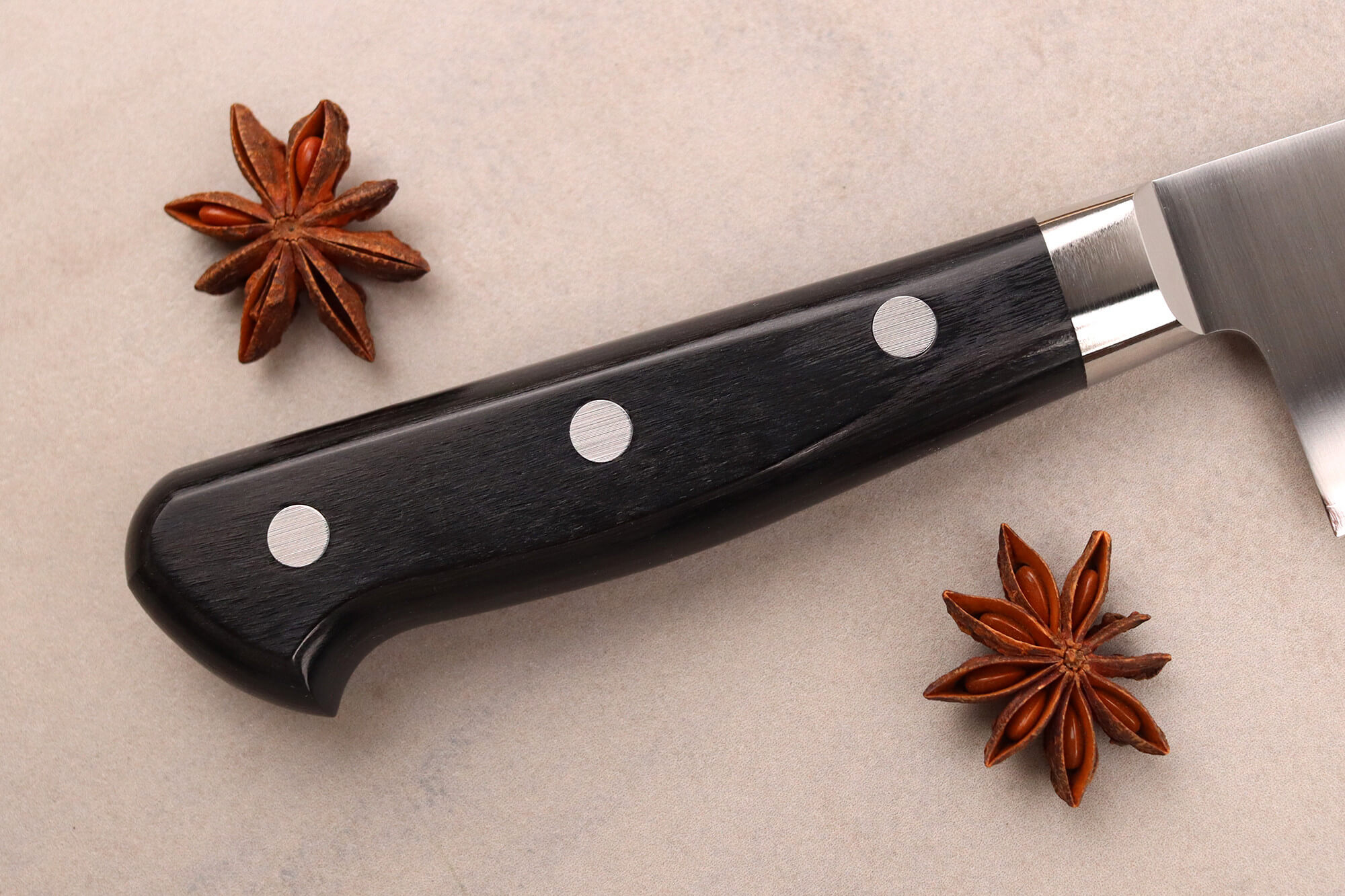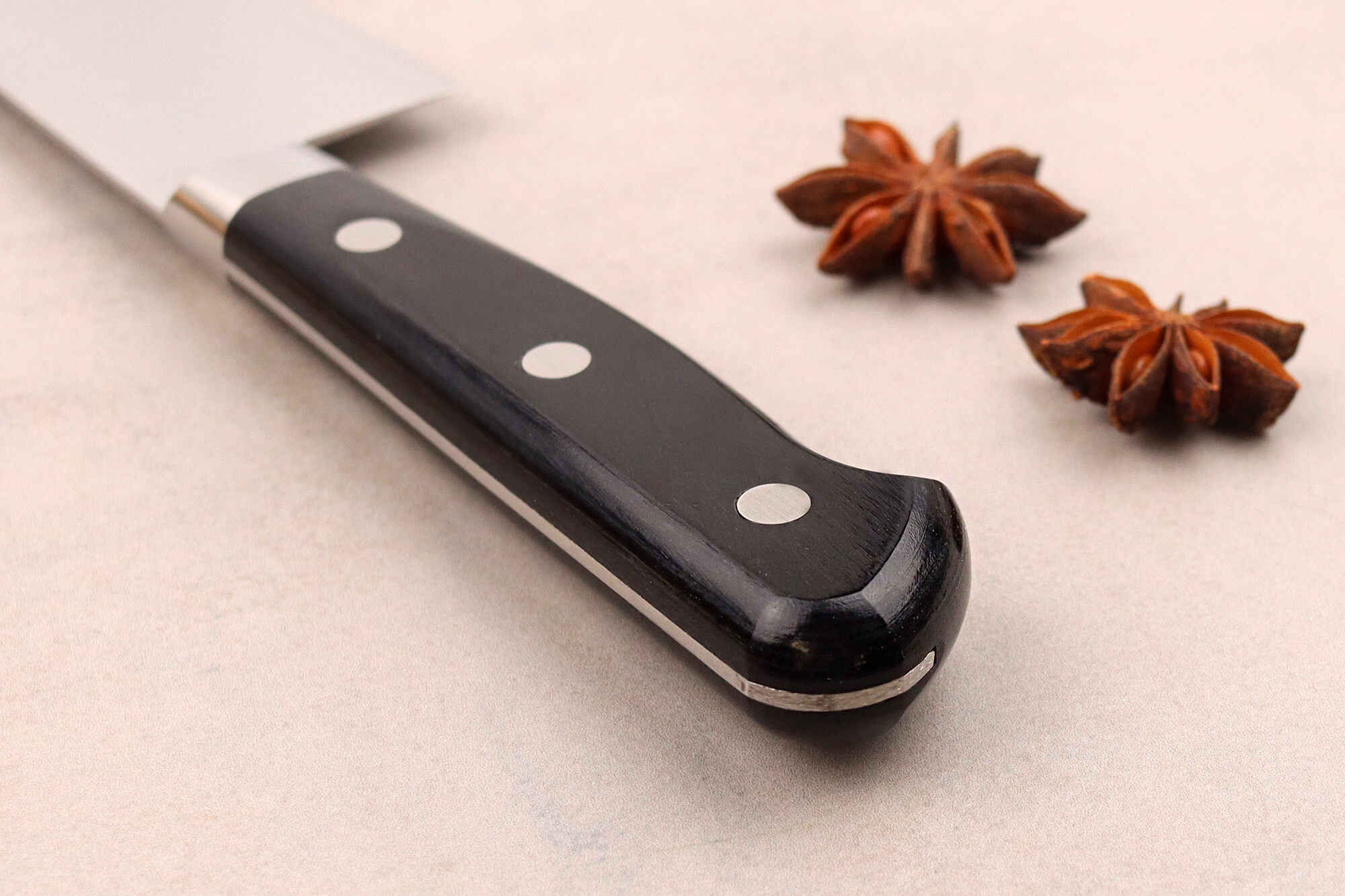 La lame est solidement maintenue au manche par trois rivets en acier inoxydable, fixant la soie de la lame pour une robustesse accrue. Une mitre en inox est ajoutée entre la lame et le manche pour conférer un meilleur équilibre à votre couteau japonais.