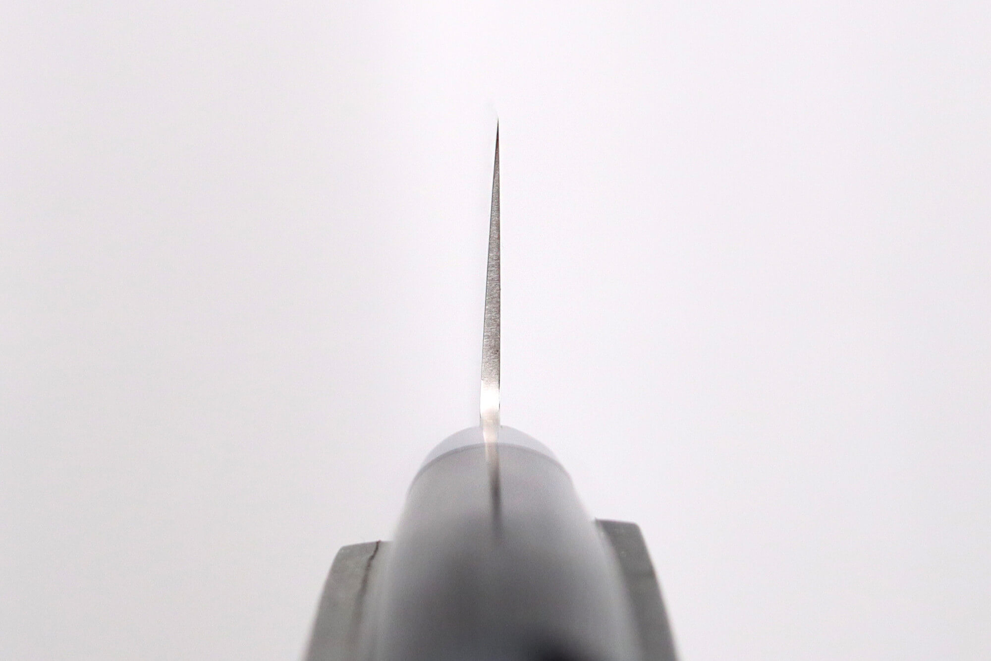Les artisans Takamura accordent une attention toute particulière à la finition du tranchant. Leur philosophie est simple : si un ingrédient se brise avant même que la lame ne touche la planche à découper, c’est que le couteau n’a pas accompli sa mission correctement. Un bon couteau doit trancher net sans écraser les fibres des aliments, et c’est ce que garantit la précision de l’affûtage des couteaux Takamura !