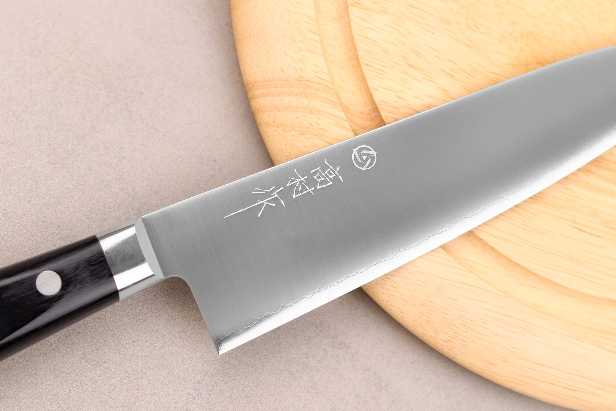 La surface de votre lame est délicatement polie, un travail artisanal qui confère une touche d'élégance à chaque couteau artisanal japonais. Votre couteau de cuisine japonais a aussi été gravée avec des kanjis pour lui donner un caractère plus authentique !