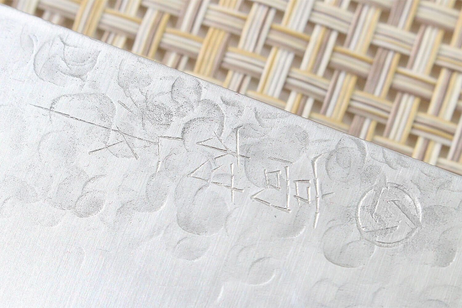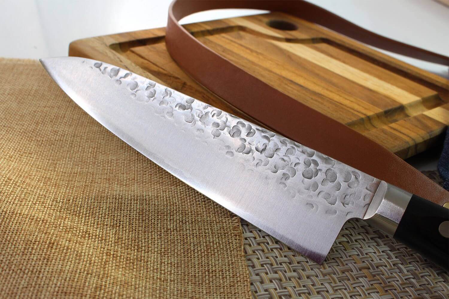 La surface supérieure de la lame est finement martelée, et ce martelage diffère sur chaque couteau. Le martelage est un procédé ancestral, et s'il est magnifique visuellement parlant, il est également apprécié car agit un peu à la manière des alvéoles, en créant des micro bulles d'air entre la lame et l'aliment coupé, pour éviter que ce dernier ne colle de trop à l'acier.