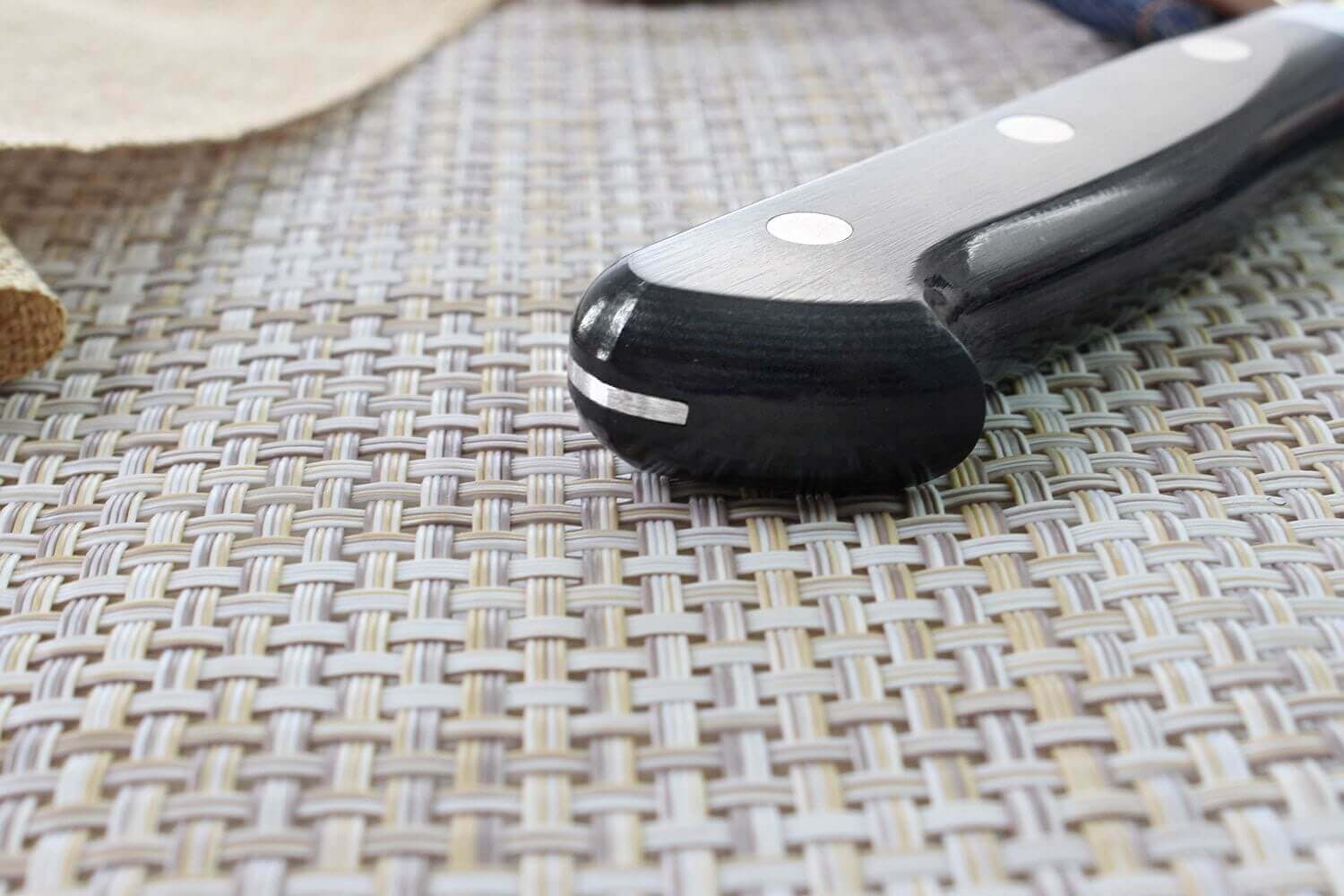 Le manche est fabriqué en Pakkawood noir, c'est un matériau composite qui rassemble des lamelles de bois compressées et de la résine. Le tout est assemblé à chaud. Il dispose de beaucoup d'avantages, comme par exemple son côté antibactérien, ou sa résistance aux variations de température et à l'humidité. Il est complété par 3 rivets qui viennent le maintenir en position sur la lame se prolongeant au bout du couteau.