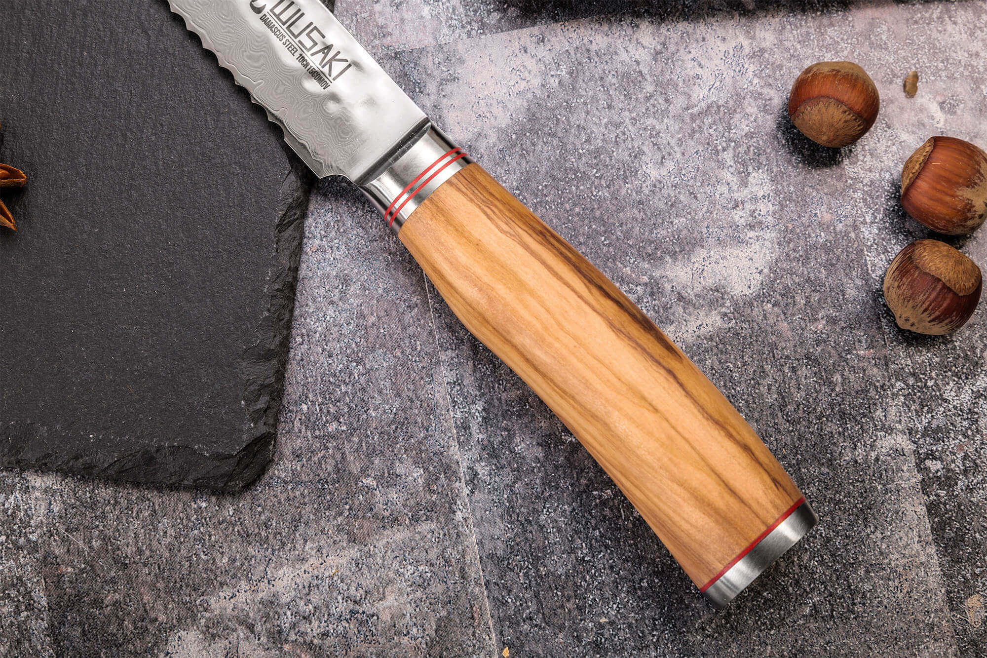 Le manche est un élément central du couteau Wusaki Damas 10Cr. Il est conçu en bois d'olivier, préalablement poncé puis traité pour être doux et agréable. Ce bois précieux, dont l'odeur fruitée est caractéristique, contraste parfaitement avec l'acier de la lame. Ses veines sont uniques sur chaque couteau : prestige assuré !