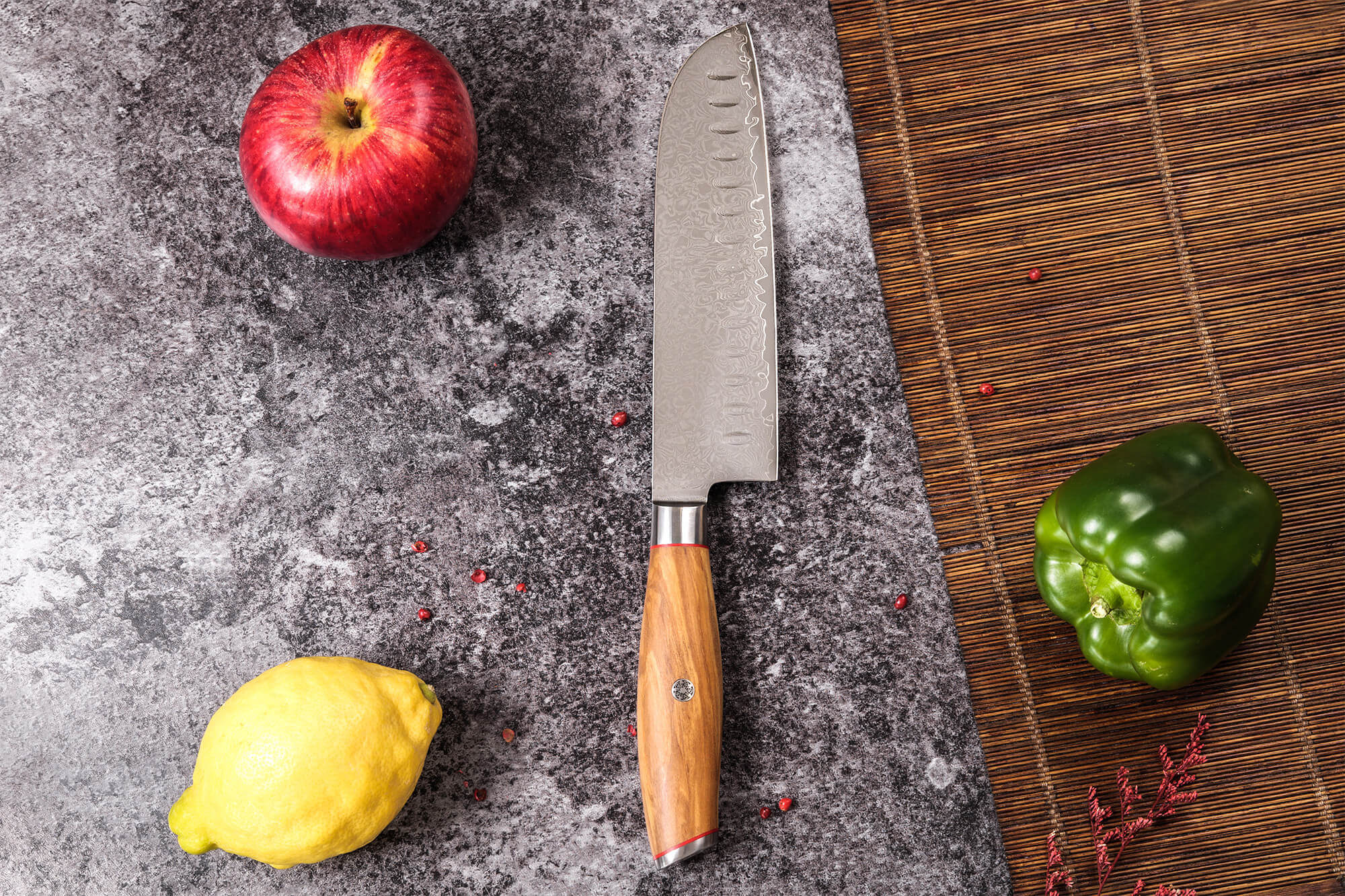 Votre couteau santoku ici présent dispose d'une lame en acier inoxydable 10Cr15CoMoV. Avec son taux de carbone à environ 1,05%, il se place bien au dessus de la moyenne observée sur les couteaux occidentaux (eux autour de 0,5%). Cette concentration en carbone permet à l'alliage d'atteindre les 60 HRC : la lame est alors efficace malgré les découpes que vous enchaînez.