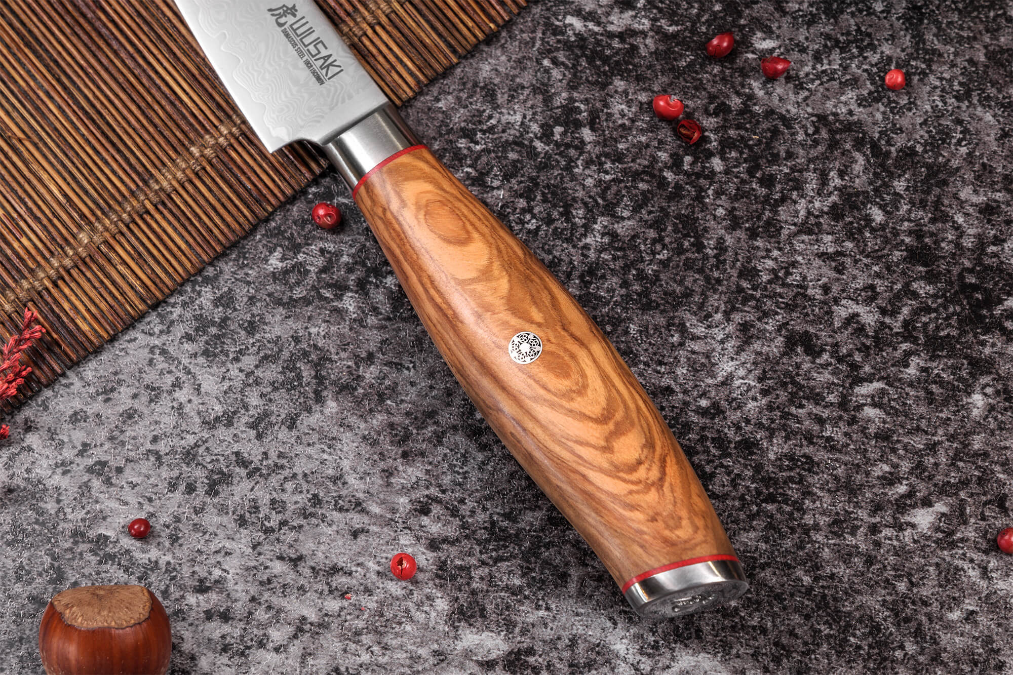 Le manche est un élément très important dans la composition du couteau Wusaki Fujiko 10Cr. Il est fabriqué dans du bois d'olivier, qui a été poncé et traité pour vous offrir un toucher doux très agréable en main. Cette essence à l'odeur fruitée possède un beau veinage, qui est d'ailleurs unique à chaque couteau (le bois étant un matériau naturel, c'est tout à fait normal). L'olivier présente d'autres avantages, comme par exemple sa bonne résistance face à l'humidité, ou encore sa densité qui le rend peu sensible à la déformation.