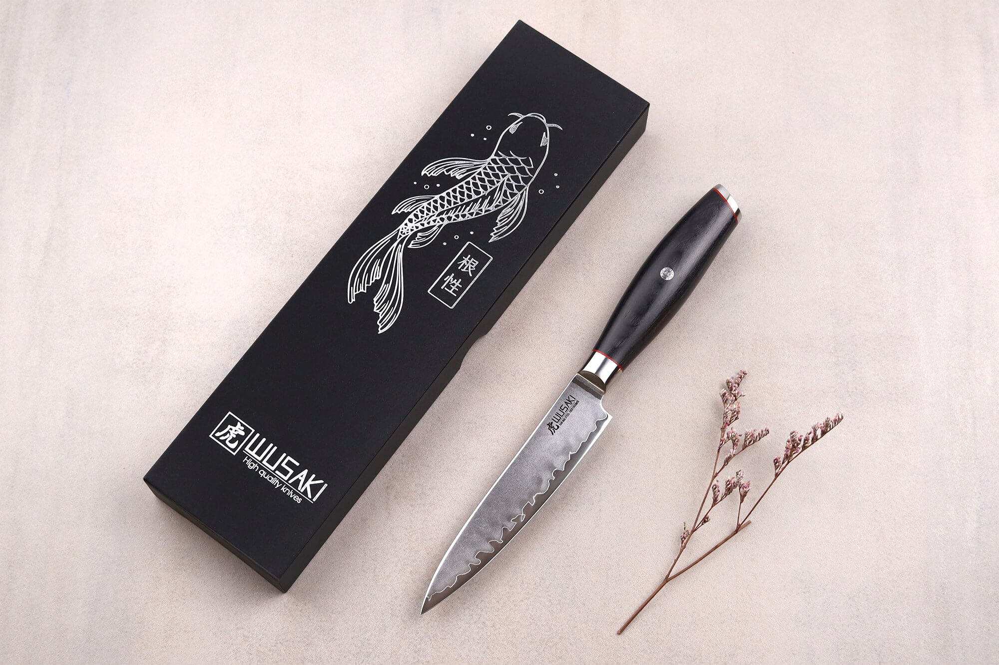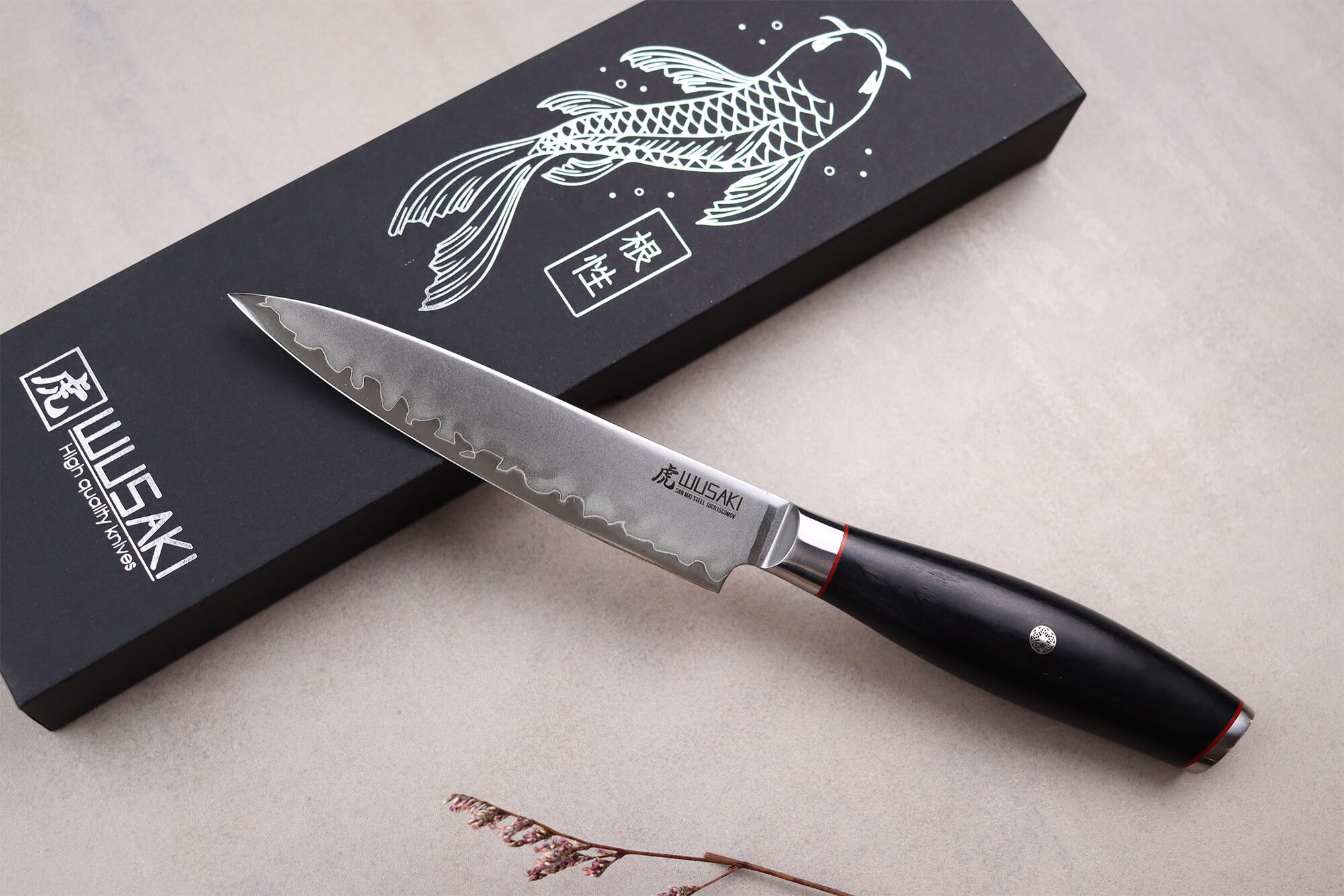Votre couteau wusaki fujiko black est livré dans son élégant coffret protecteur. Celui-ci est décoré d'une superbe carpe koï traditionnelle. Avec cette boîte, vous pouvez facilement offrir le couteau, ou bien tout simplement vous l'offrir et le ranger en toute sécurité après son nettoyage.