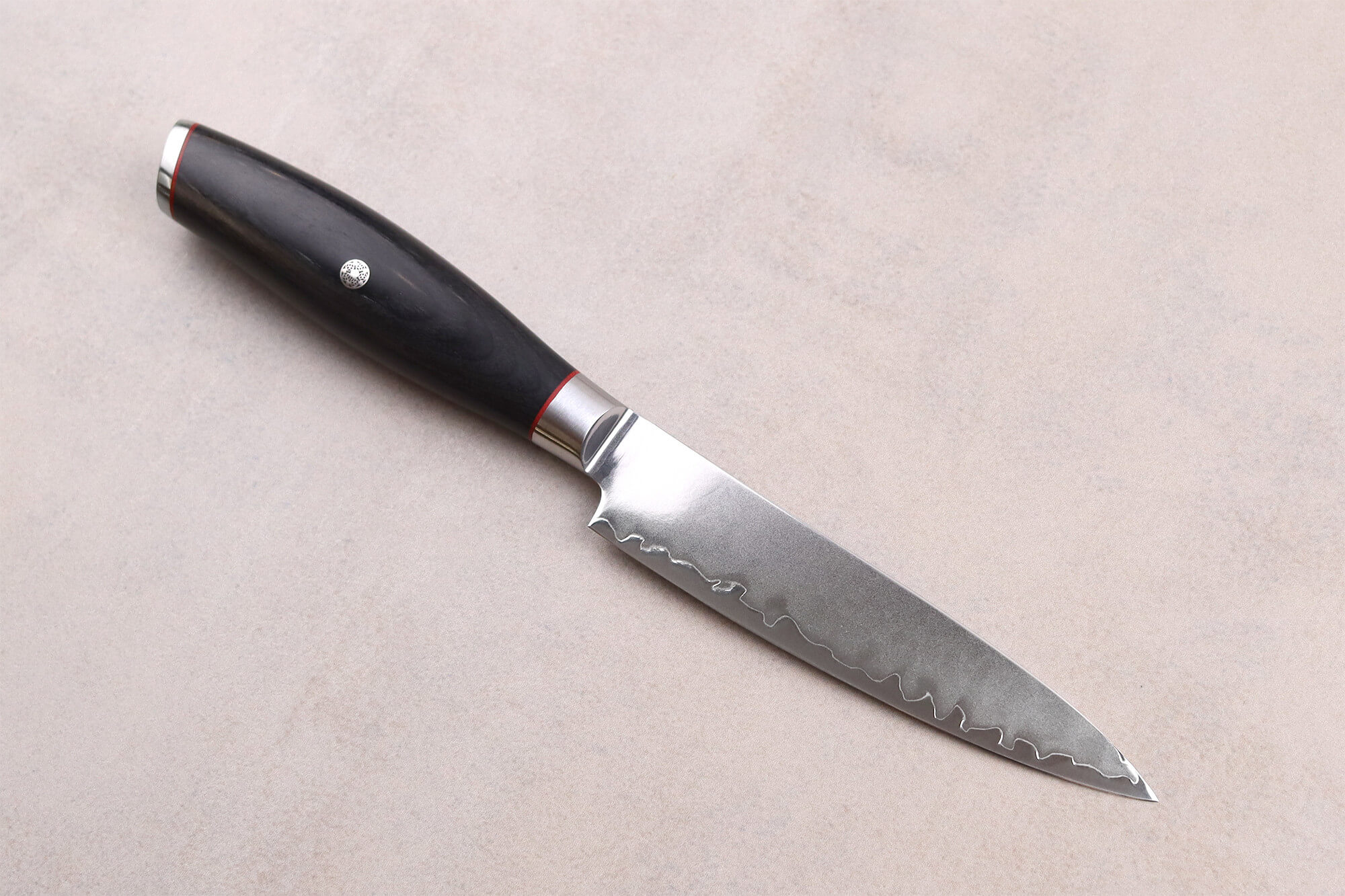 Votre couteau de cuisine Wusaki dispose d'un manche en bois de pakka noir. C'est un matériau composite contenant du bois laminé chauffé à de la résine, le tout étant compressé. En résulte un matériau impeccable qui résiste aux variations de température et à l'humidité. Le Pakkawood est très utilisé en cuisine grâce à ses nombreux avantages. Il ne nécessite pas d'entretien particulier et assure un usage agréable et durable.
