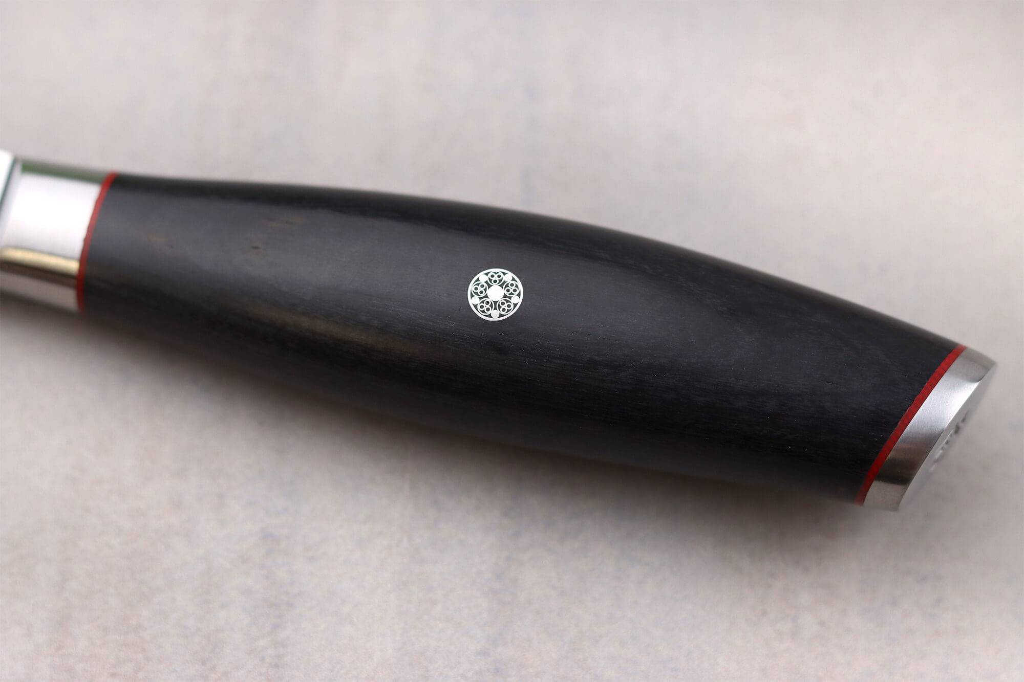 Enfin, un fin liseré rouge agrémente chaque extrémité du couteau. La teinte rouge apporte un élégant contraste au pakka noir.
