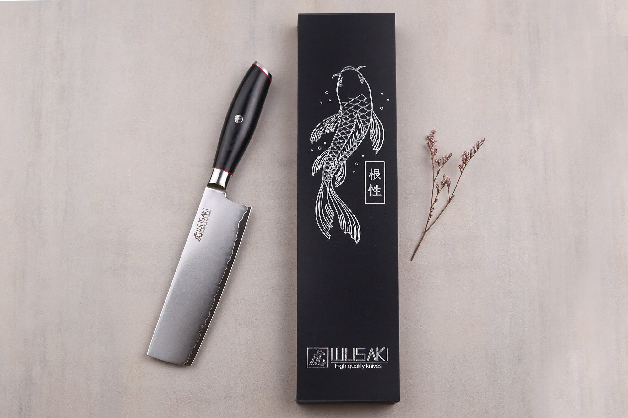 Chaque couteau wusaki fujiko black est livré dans son coffret protecteur. La boîte est élégamment ornée d'une carpe koï traditionnelle. Grâce au coffret, vous pouvez facilement offrir le couteau ou tout simplement en profiter pour ranger le couteau au sec et en sécurité une fois lavé.