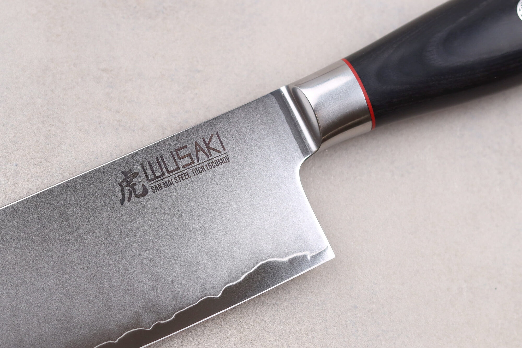 Wusaki a choisi l'acier inoxydable 10Cr15CoMoV pour réaliser le cœur de sa structure San Maï. Il a un taux de carbone qui s'élève à environ 1,05%, ce qui le place bien au-dessus de la moyenne des couteaux occidentaux (ayant un taux de carbone d'environ 0,5%). Cette forte concentration en carbone donne à l'alliage une dureté de 60 HRC sur l'échelle de Rockwell : la lame reste efficace malgré les nombreuses découpes.