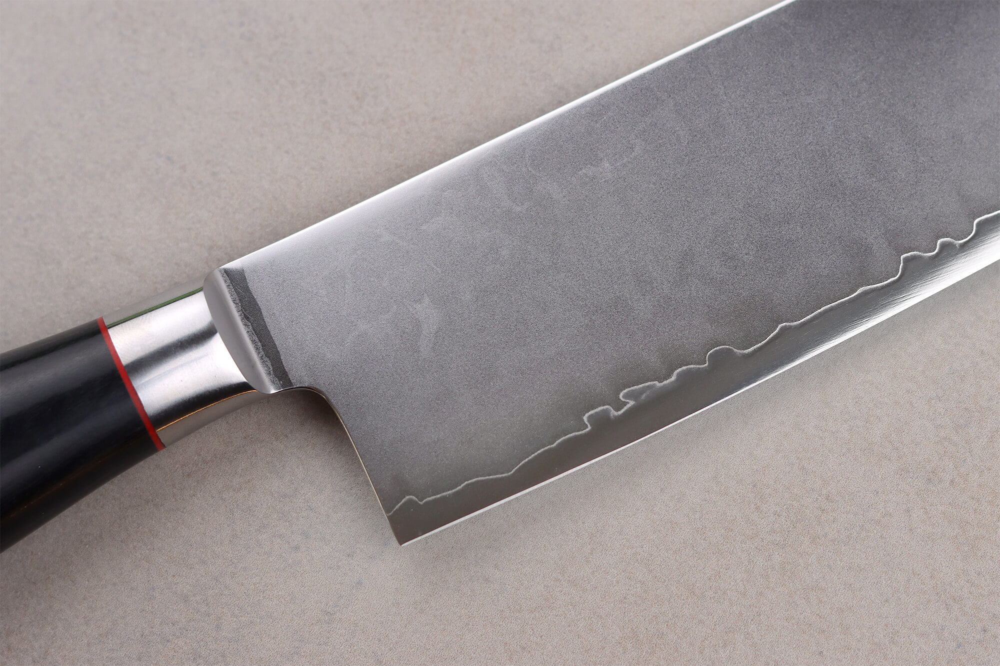 Au-dessus du noyau de qualité se trouve une couche d'acier inoxydable supplémentaire, plus doux que l'acier 10Cr. C'est ainsi que le San Maï est créé, car les 3 couches sont bien là. On voit d'ailleurs l'endroit où se rencontrent les aciers près du fil de coupe : cela forme une vague aléatoire qui court sur toute sa surface.