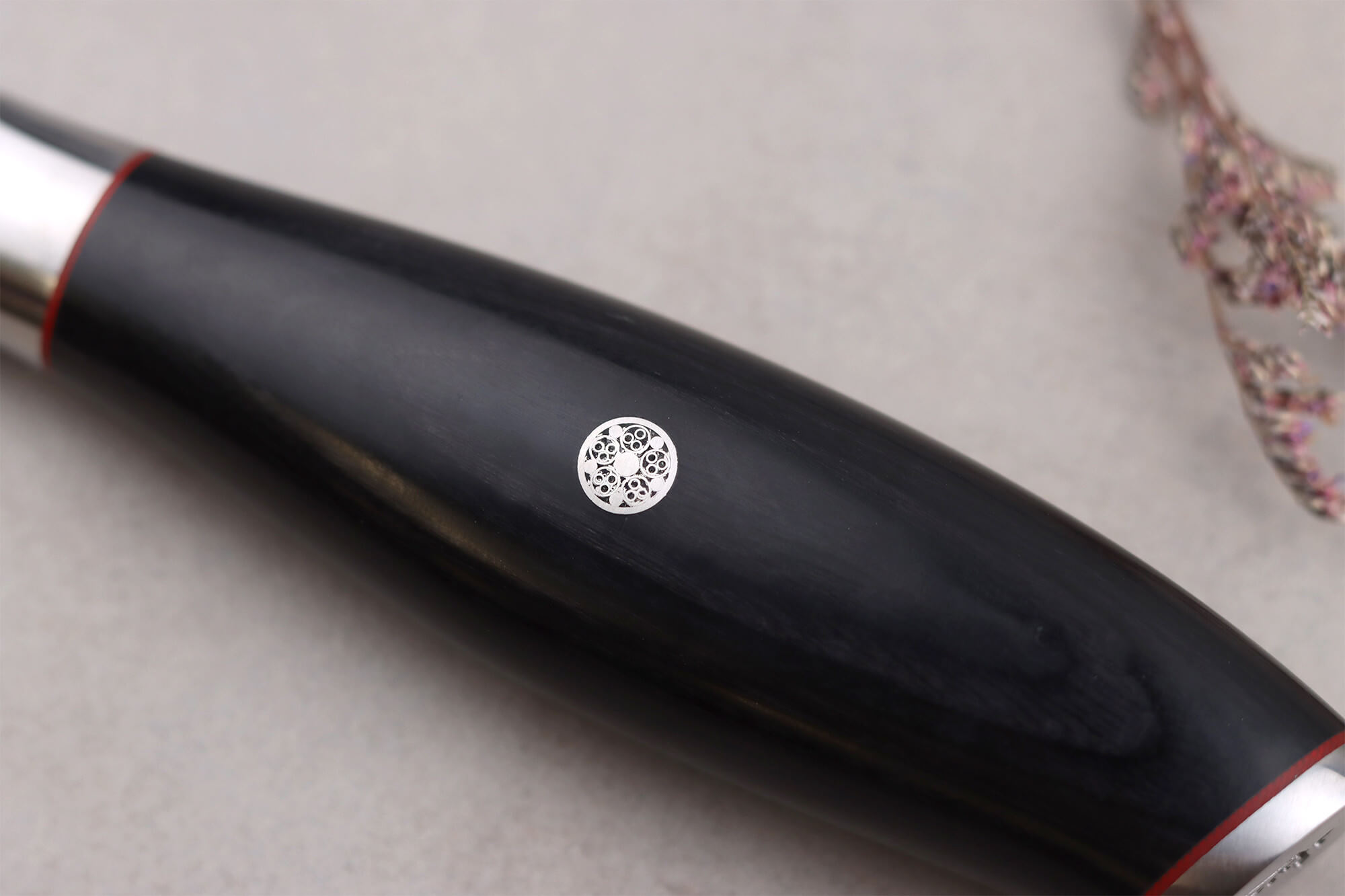 Manche en pakka noir avec liserés rouges élégants et rivet en mosaïque