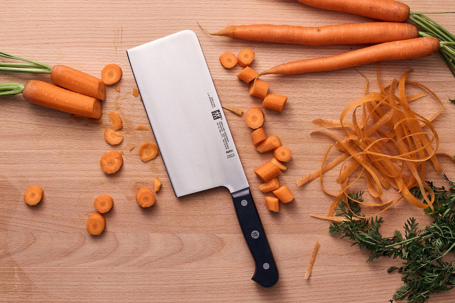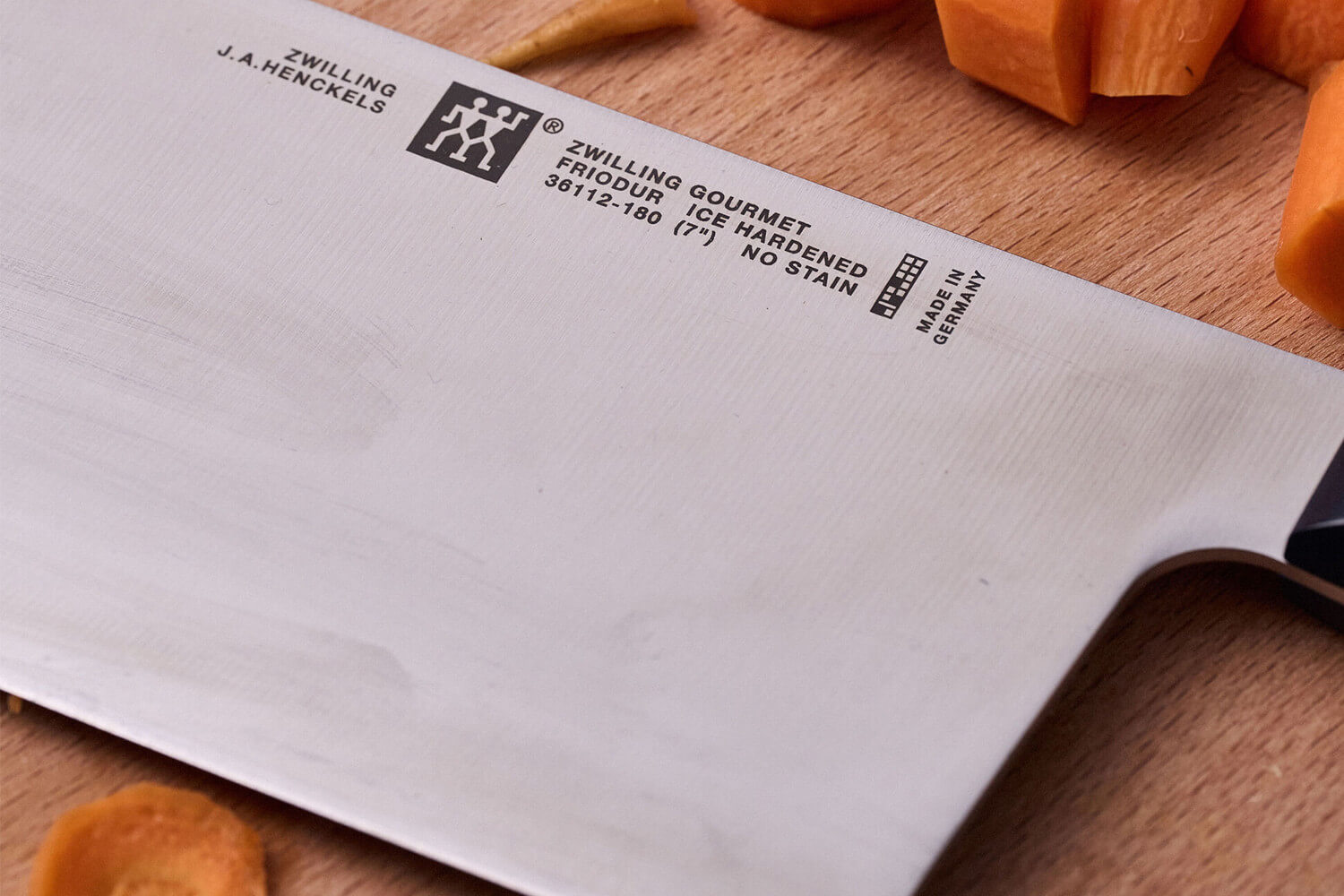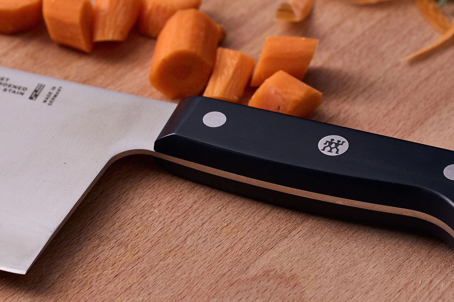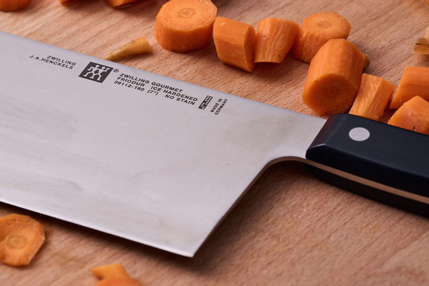 La lame mesure 18cm de long et 8,3cm de haut, ce qui offre une surface de coupe généreuse idéale pour manipuler de grands volumes d’ingrédients. Elle est fabriquée en acier inoxydable formule spéciale Zwilling, un alliage enrichi en chrome et en carbone qui garantit à la fois résistance à la corrosion et solidité à long terme.