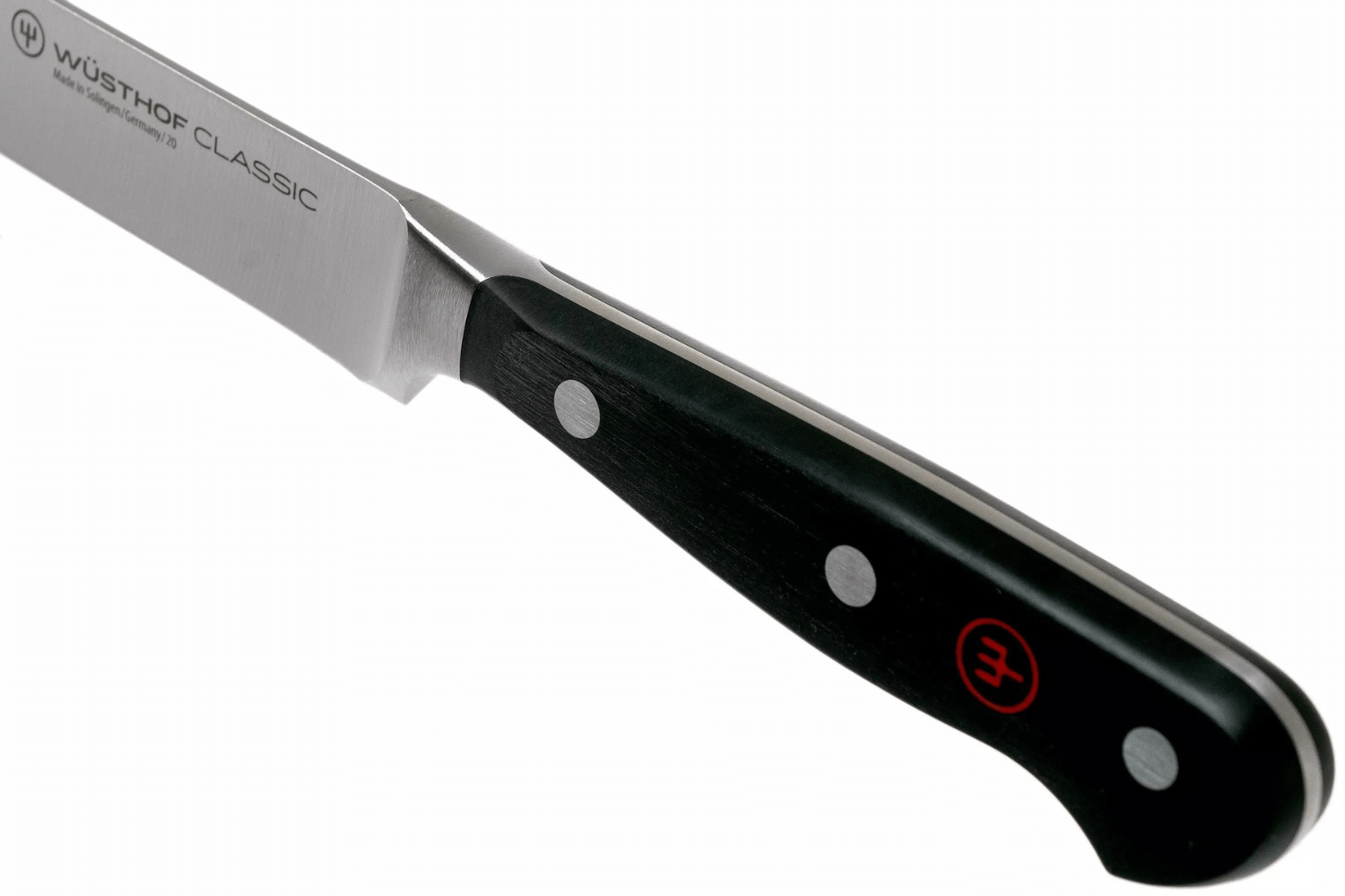 Fabriqué en matière synthétique, le manche est ergonomique et offre une prise en main confortable. Il est doté de 3 rivets de fixation afin de raffermir l'ensemble. D'ailleurs, le logo de la marque est discrètement placé sur la poignée. Ce détail prouve l'authenticité du produit Wusthof.