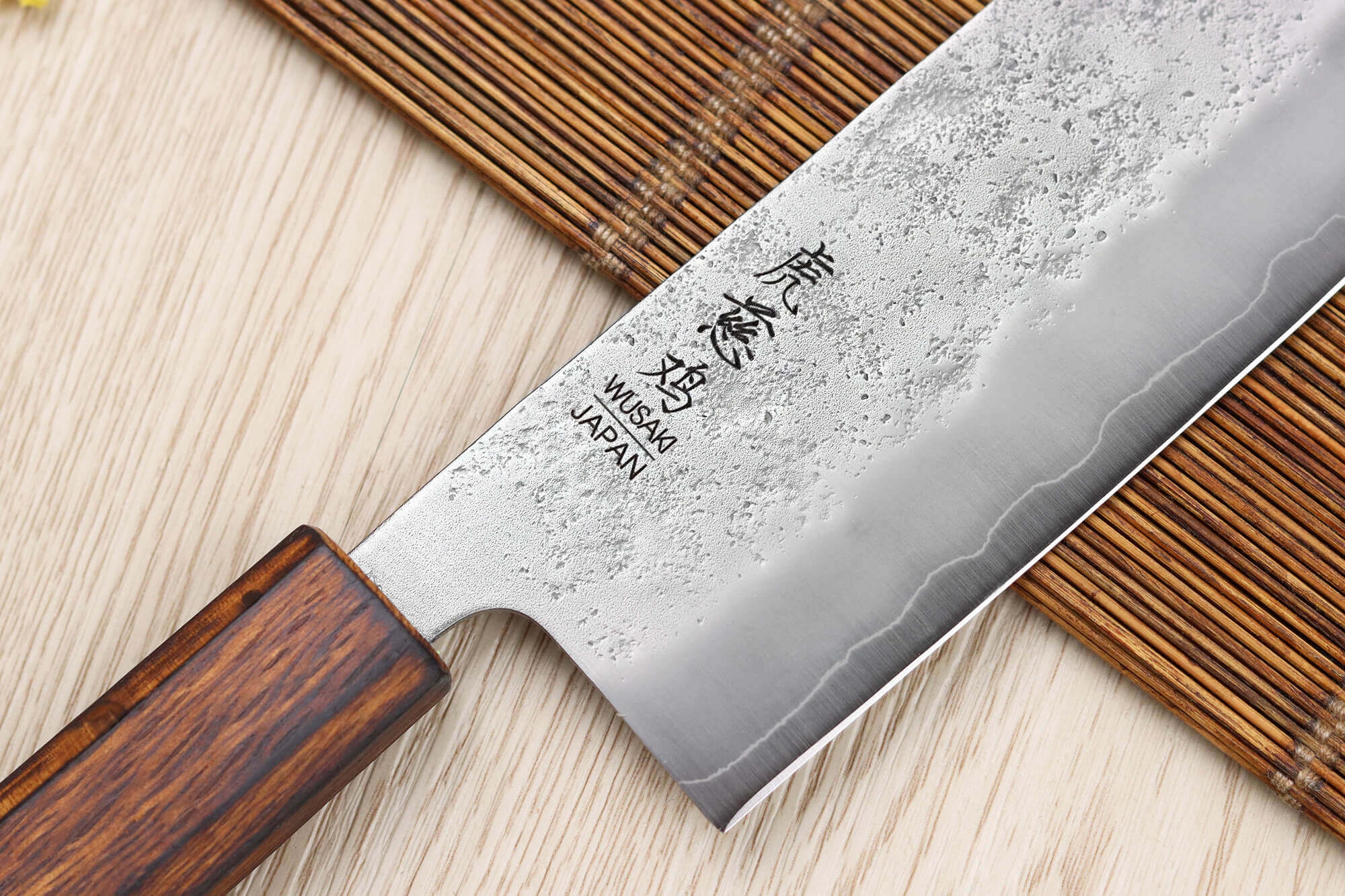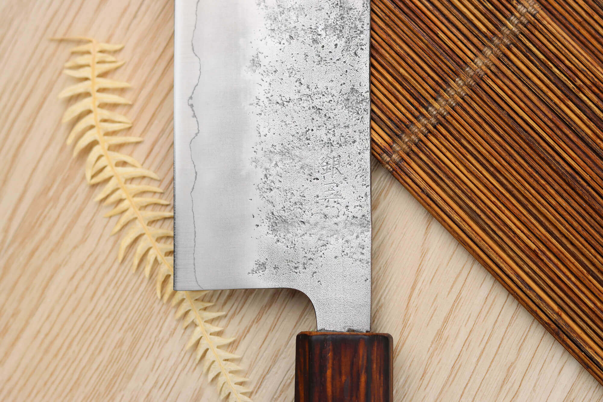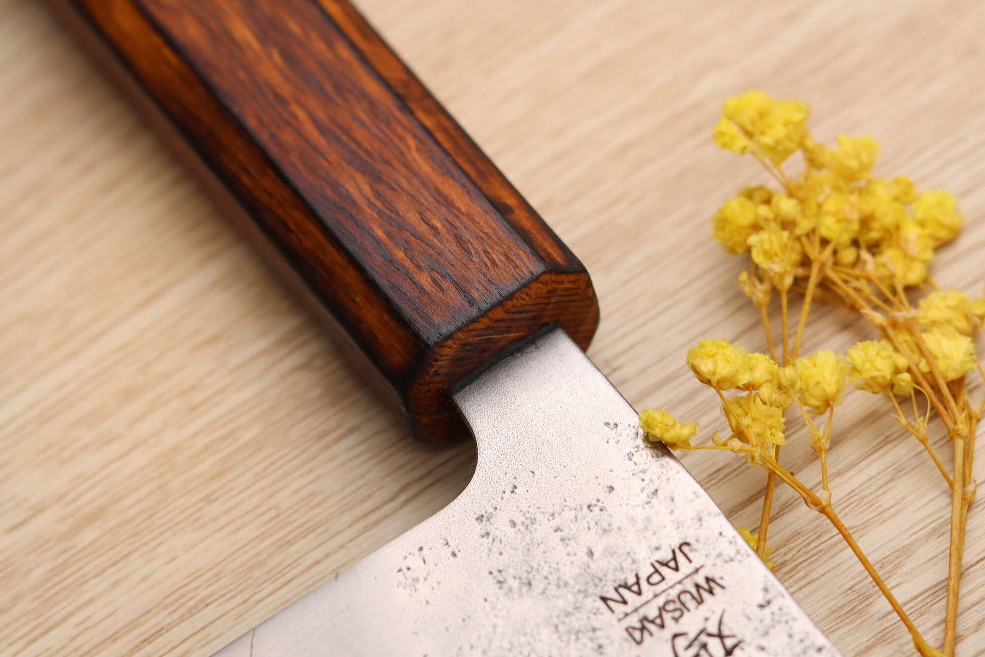 Le logo a été gravé sur le devant de la lame et de beaux kanji ont été gravés finement au dos, pour toujours plus d'authenticité. Enfin, le couteau a été martelé de façon originale, on peut y voir de jolis motifs piquetés, comme si des gouttes d'eau avaient éclaboussé la surface de coupe.