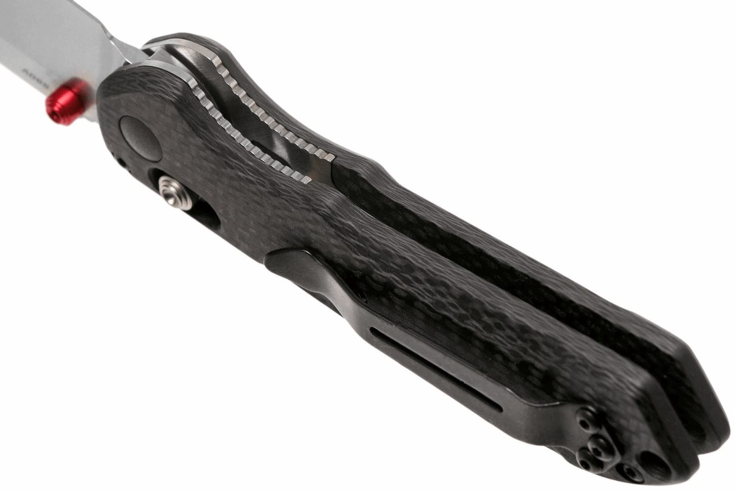 Son manche ergonomique est fabriqué en fibre de carbone extrêmement résistante et légère. De plus, ce matériau offre une prise en main confortable. On retrouve surtout cette matière chez les couteaux haut de gamme. Deux entretoises de couleur rouge sont visibles au niveau de la poignée, apportant un joli contraste à l'ensemble.