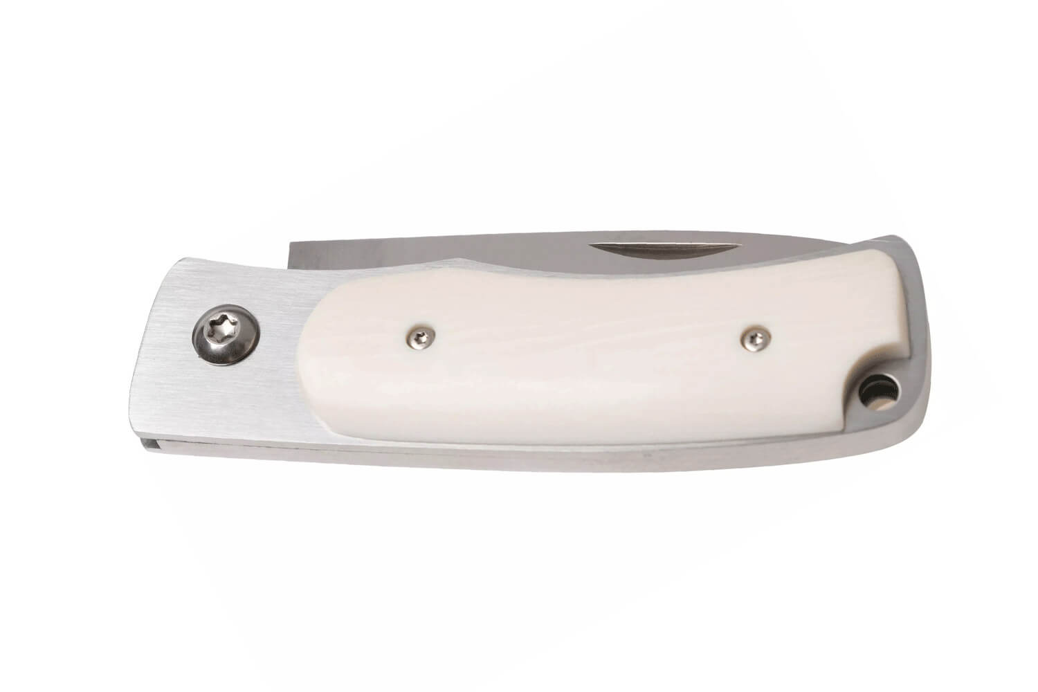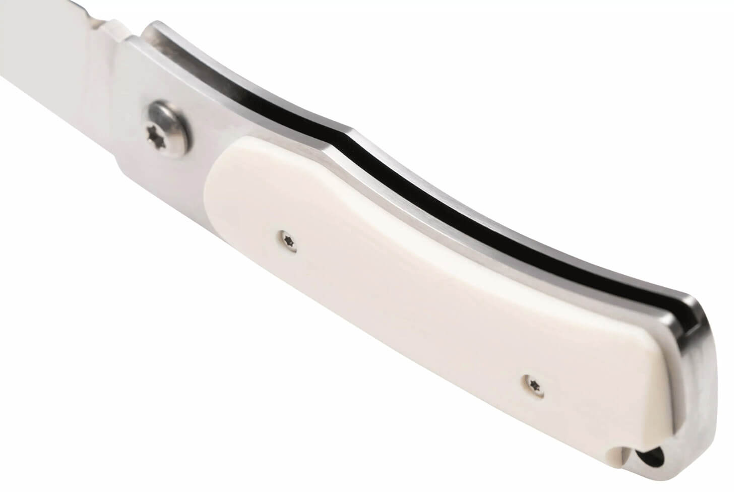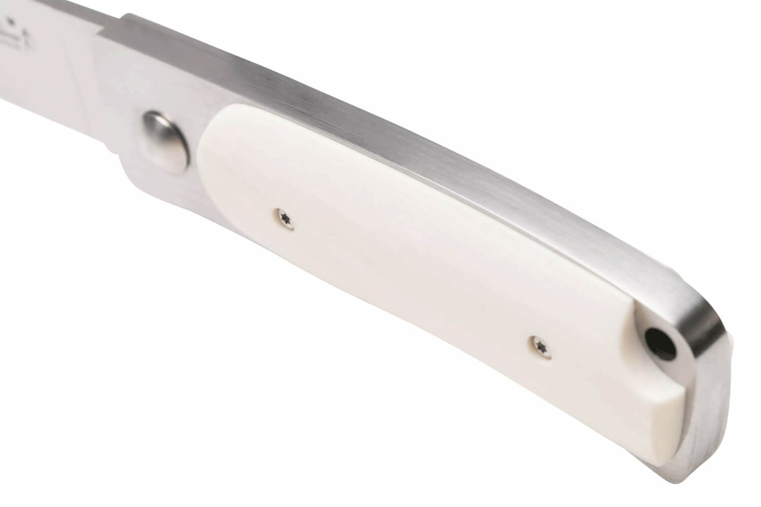 À l’opposé, le manche est constitué de doublures en acier inoxydable, avec des côtés magnifiques en Elforyn (imitation de l'ivoire). Selon votre préférence, ce type de manche peut s'entretenir avec de l'huile incolore. Il ne nécessite pas d'autres soins particuliers à part un bon nettoyage après utilisation.