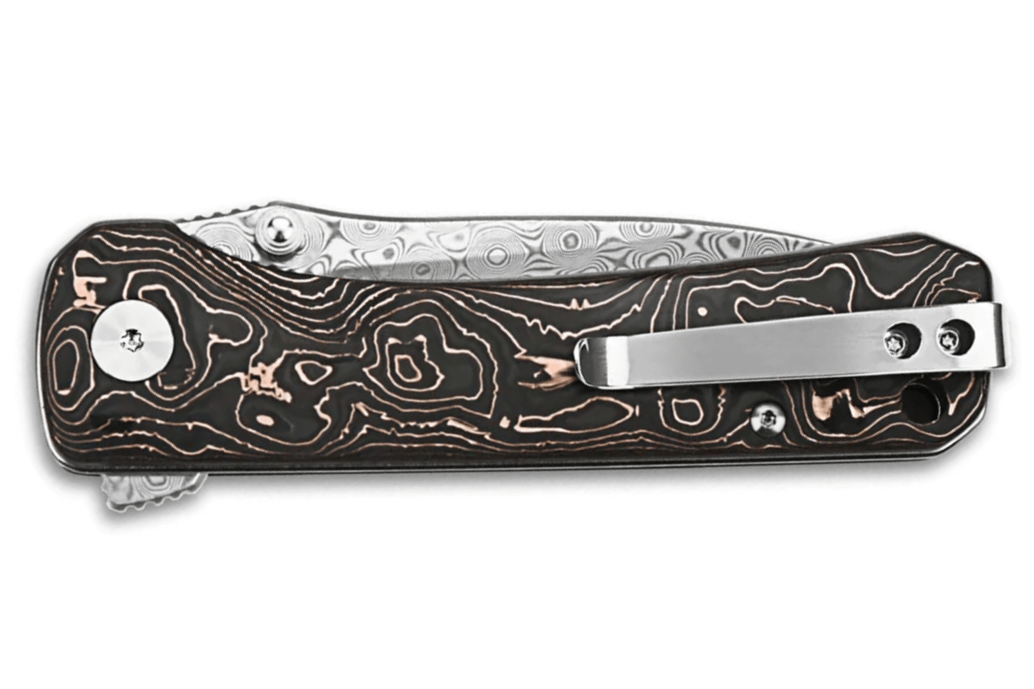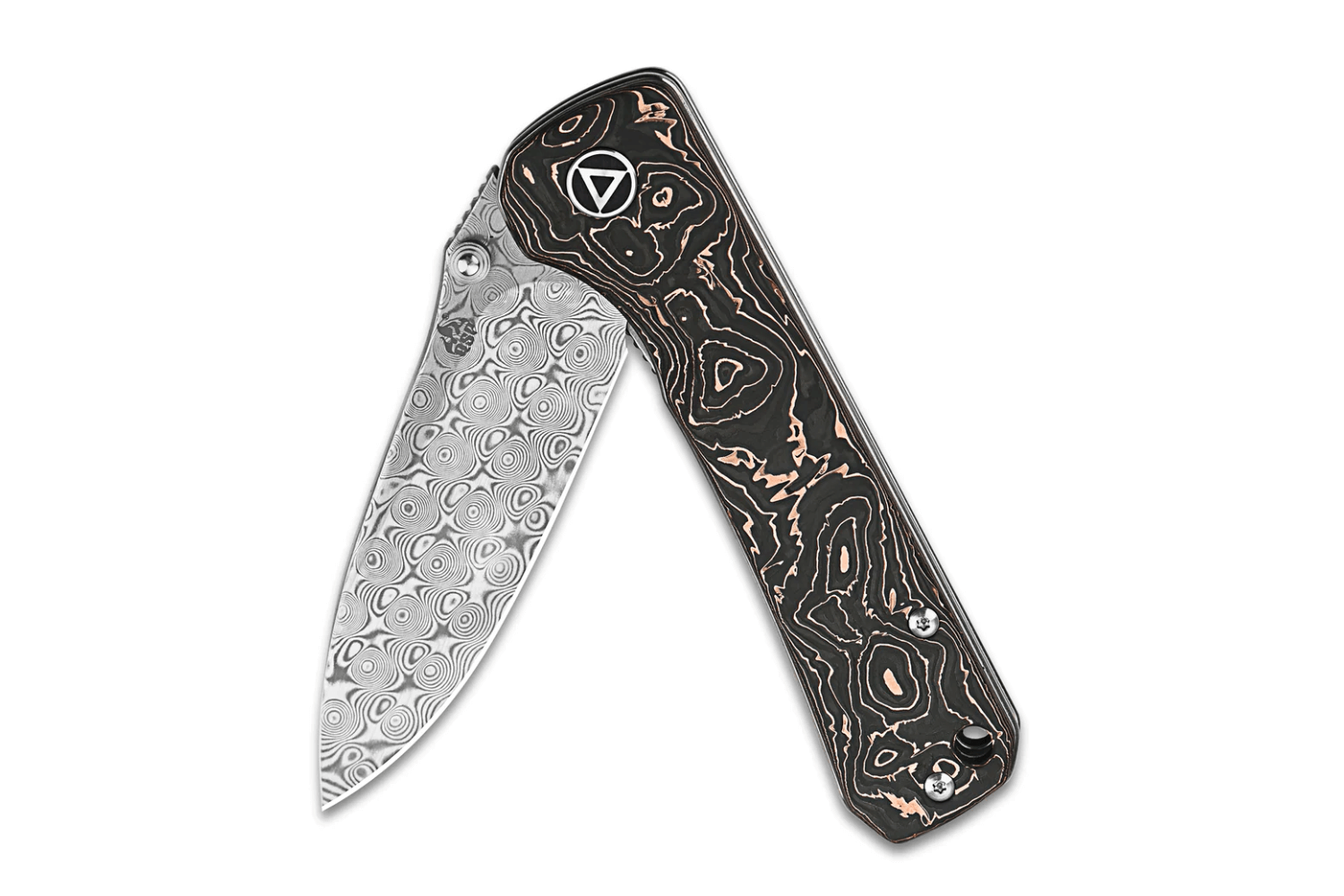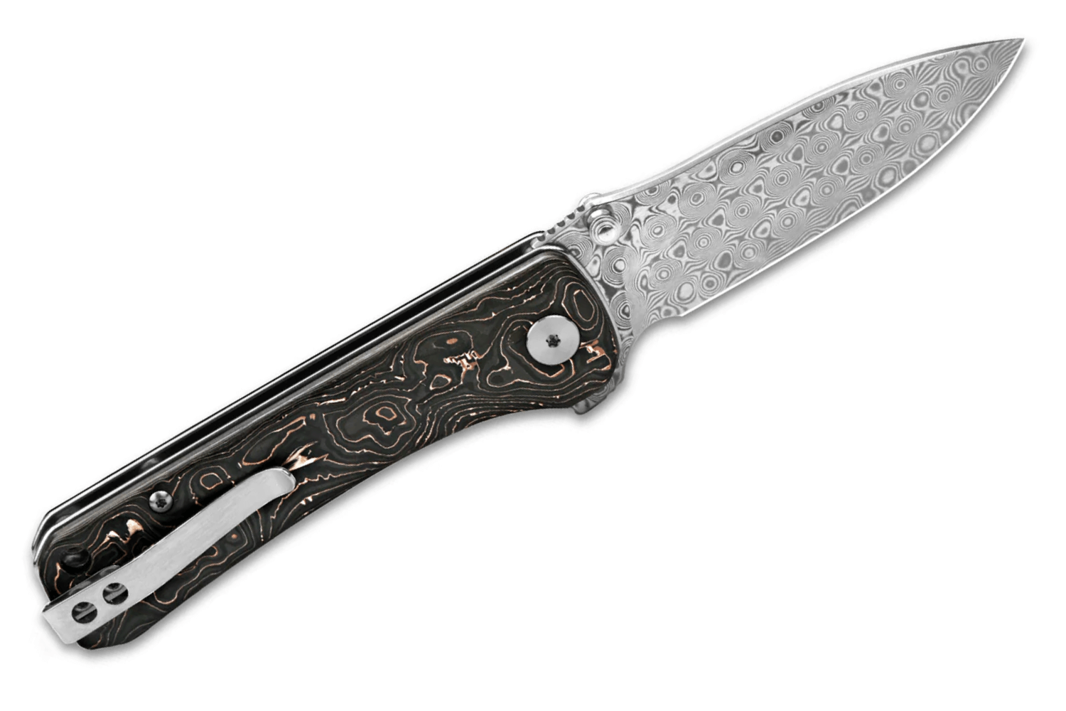 L'autre plus grand atout du couteau de poche QSP Hawk 131S est certainement sa solide poignée. Fabriqué en fibre de carbone incrustée de cuivre, ce manche dévoile un effet damassé qui s'harmonise parfaitement avec la lame. L'alliance de ces deux matériaux crée un couteau robuste et esthétiquement plaisant à contempler.