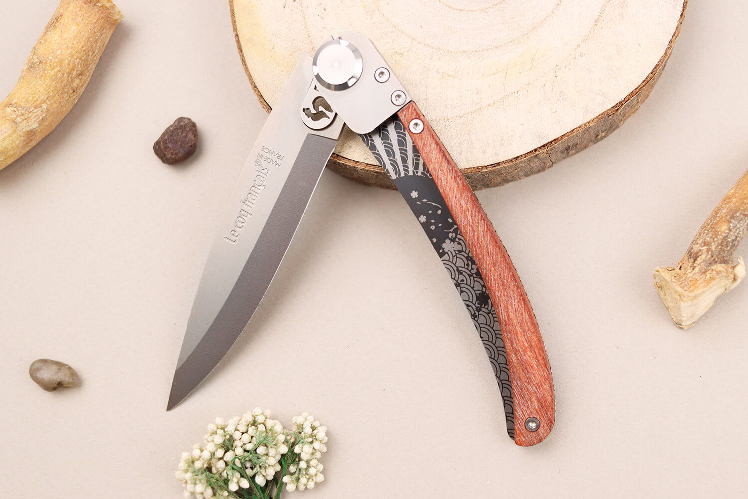 Le manche du couteau de poche Soleil Levant de Le Coq Français est orné de motifs délicats inspirés du Soleil Levant, gravés avec précision au laser. Ces motifs apportent une touche artistique au couteau, le transformant en une pièce unique qui évoque la beauté mystique du matin.