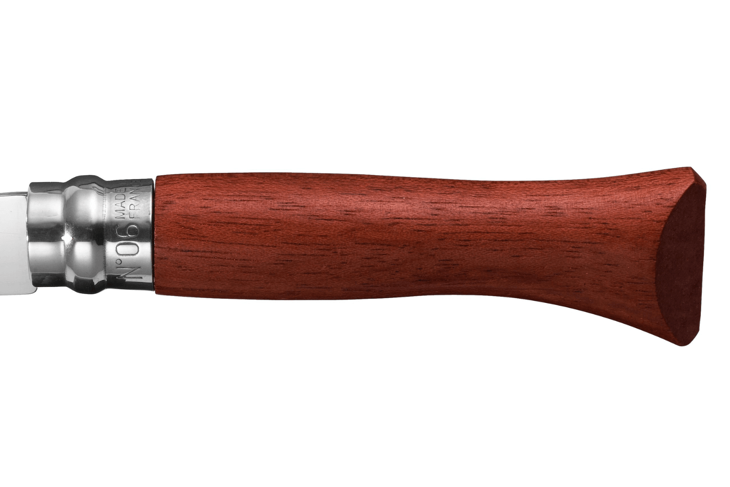 Ce couteau pliant Opinel Tradition Luxe n°06 se distingue par son manche en Padouk, un bois africain dense et finement grainé, offrant une résistance élevée à l'humidité. Sa couleur varie du brun pourpre au rose avec des veines pourpres, lui conférant une allure unique et sophistiquée.