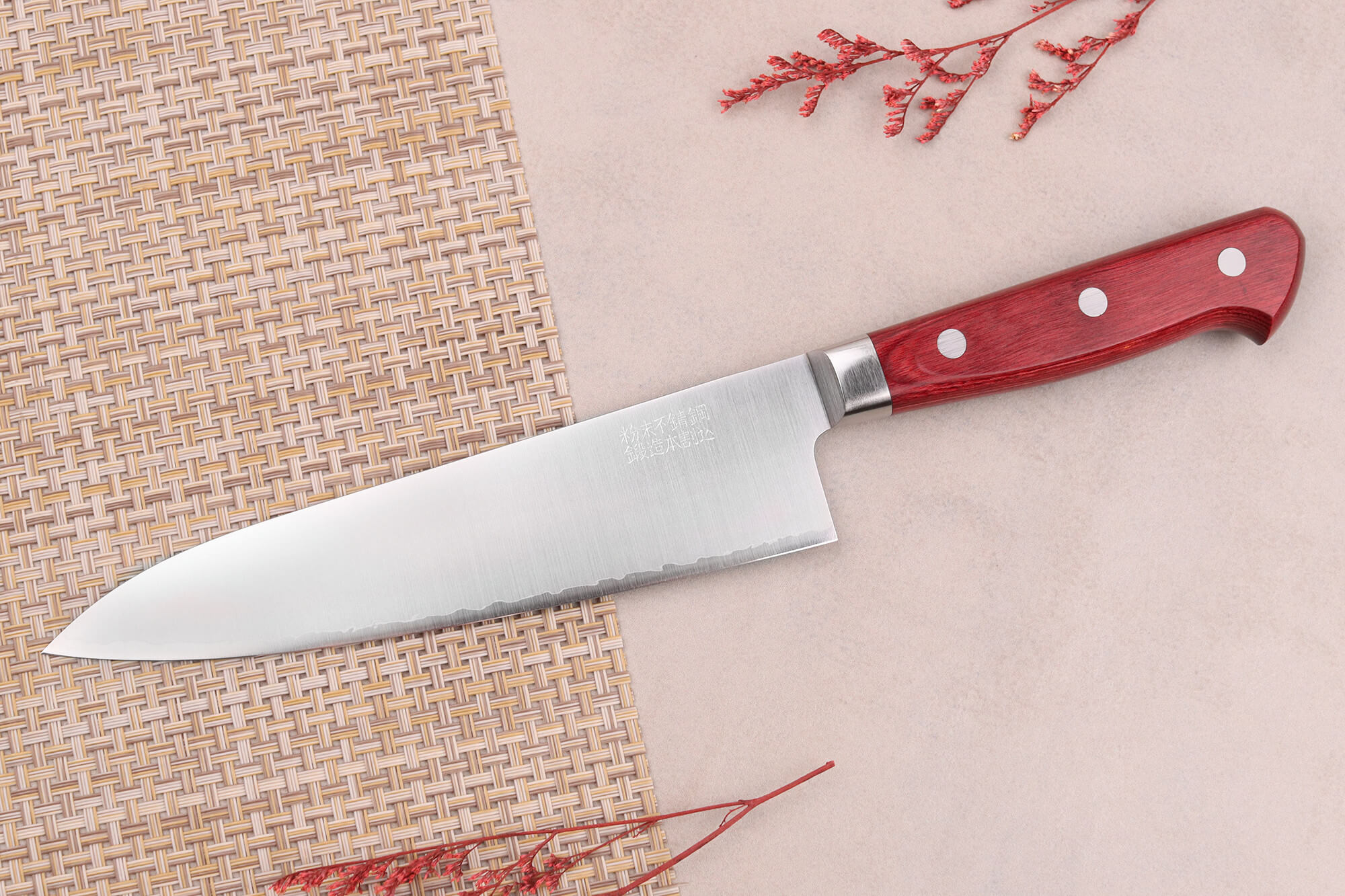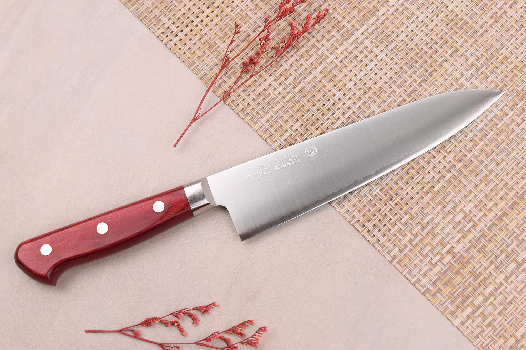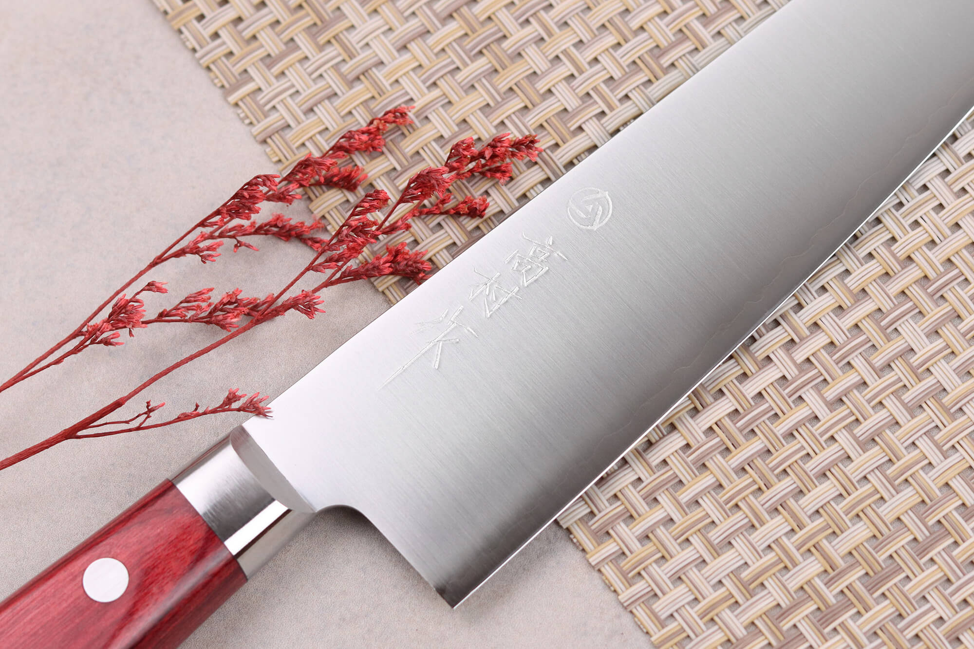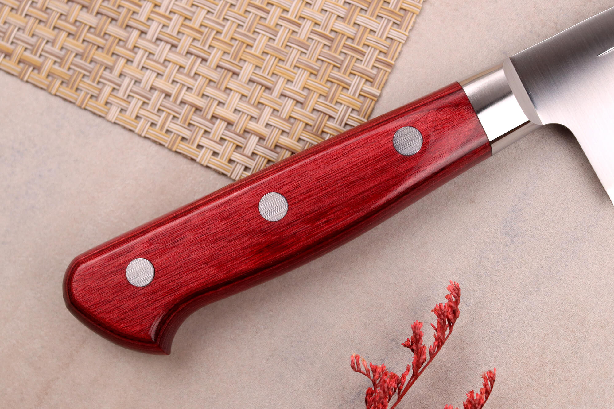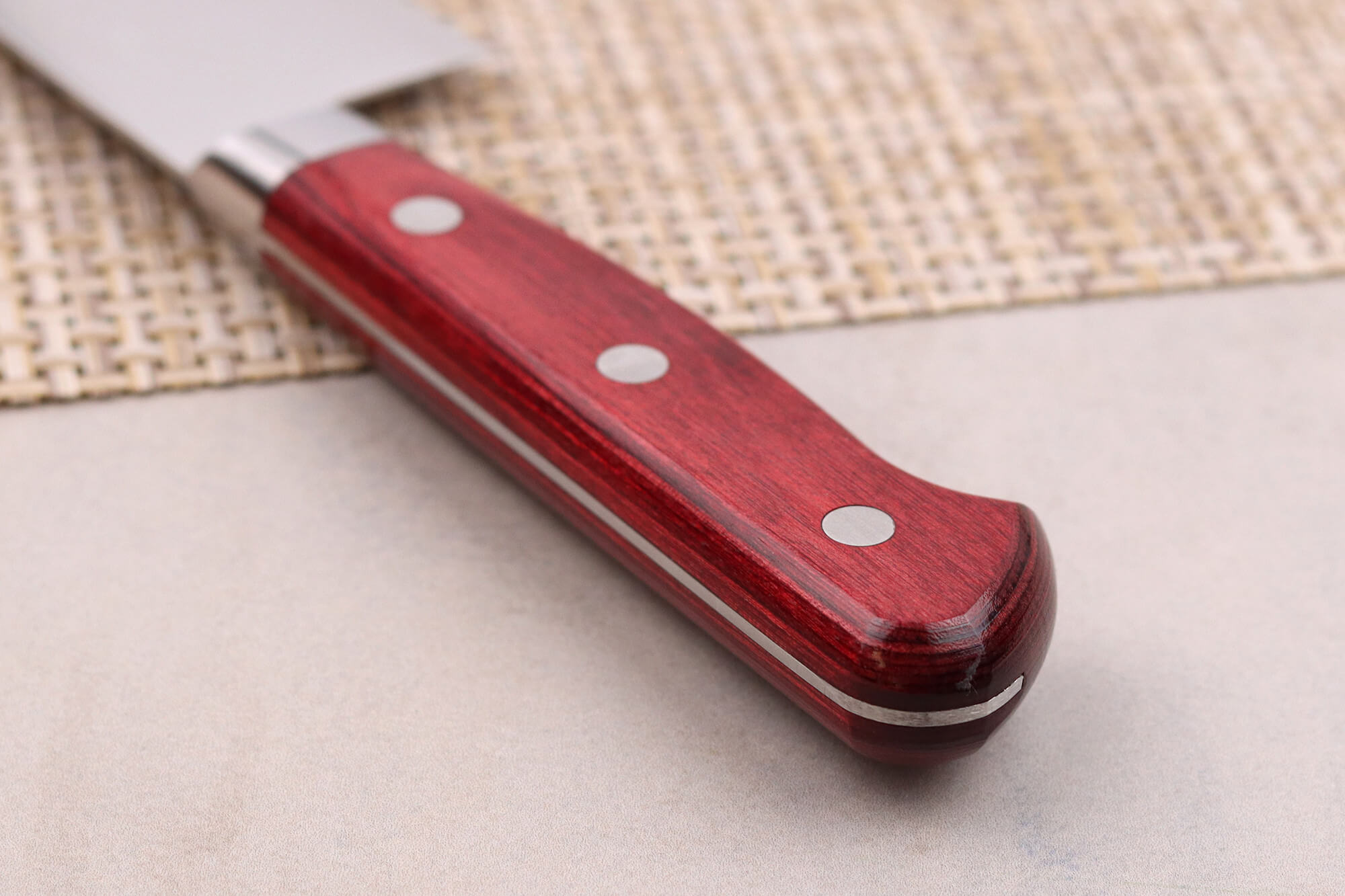 Le manche de ce couteau artisanal japonais est fabriqué en pakkawood rouge, un matériau composite constitué de fines lamelles de bois compressées et imprégnées de résine, puis assemblées sous haute température. Ce matériau présente plusieurs avantages : il est antibactérien, résistant à l'humidité et aux variations de température. Le manche est solidement fixé grâce à trois rivets en inox qui assurent sa fiabilité.