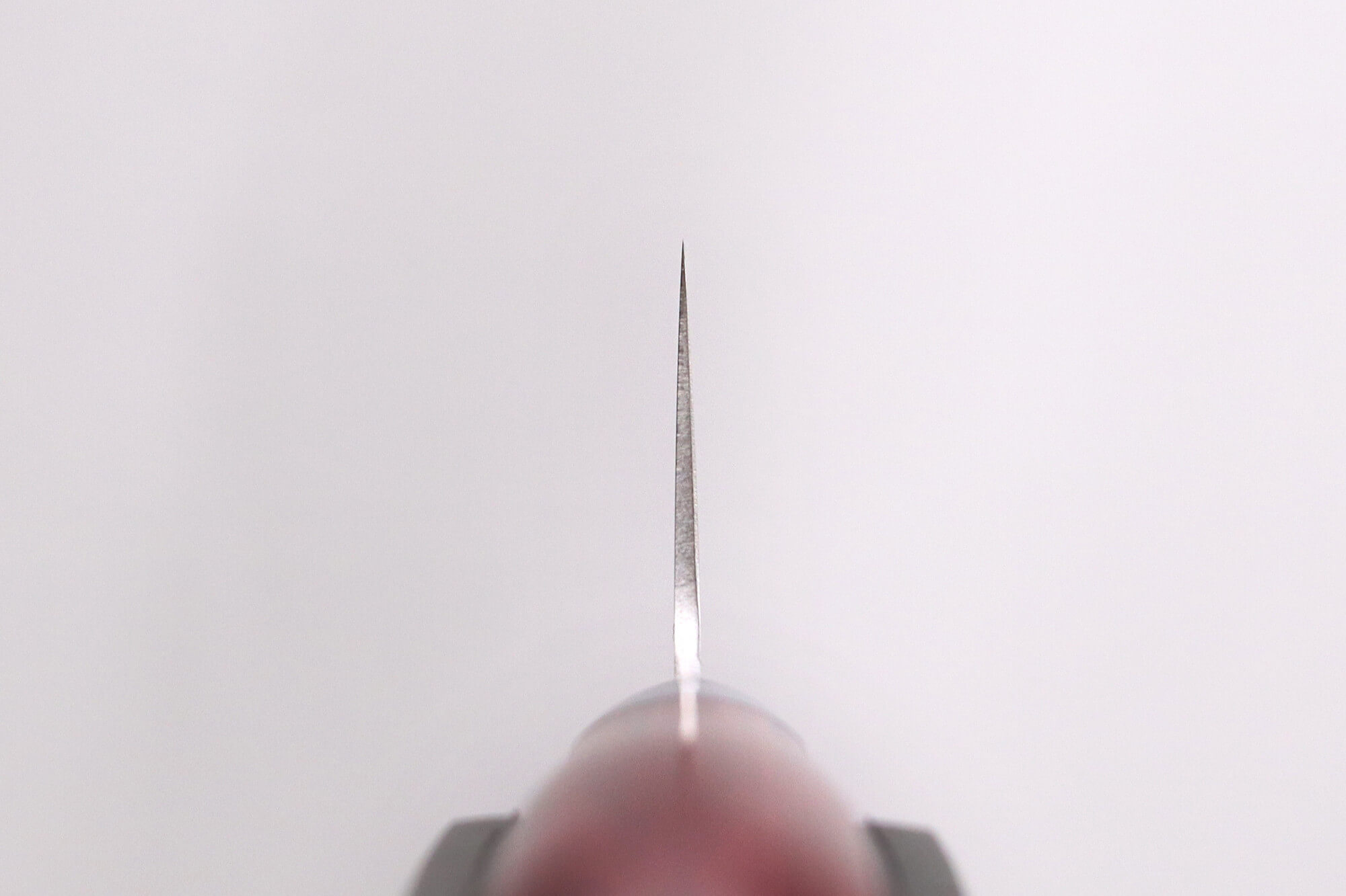 L’aiguisage en V-edge est ambidextre, permettant aussi bien aux droitiers qu'aux gauchers d’utiliser ce couteau artisanal tout en assurant des découpes précises. Pour l’entretenir et conserver son tranchant, il est recommandé d’utiliser une pierre à aiguiser à grains fins. L'émouture fine de votre couteau de cuisine japonais est de forme plate (dite "flat"), elle est robuste et reste facile à reproduire lors de l'aiguisage.