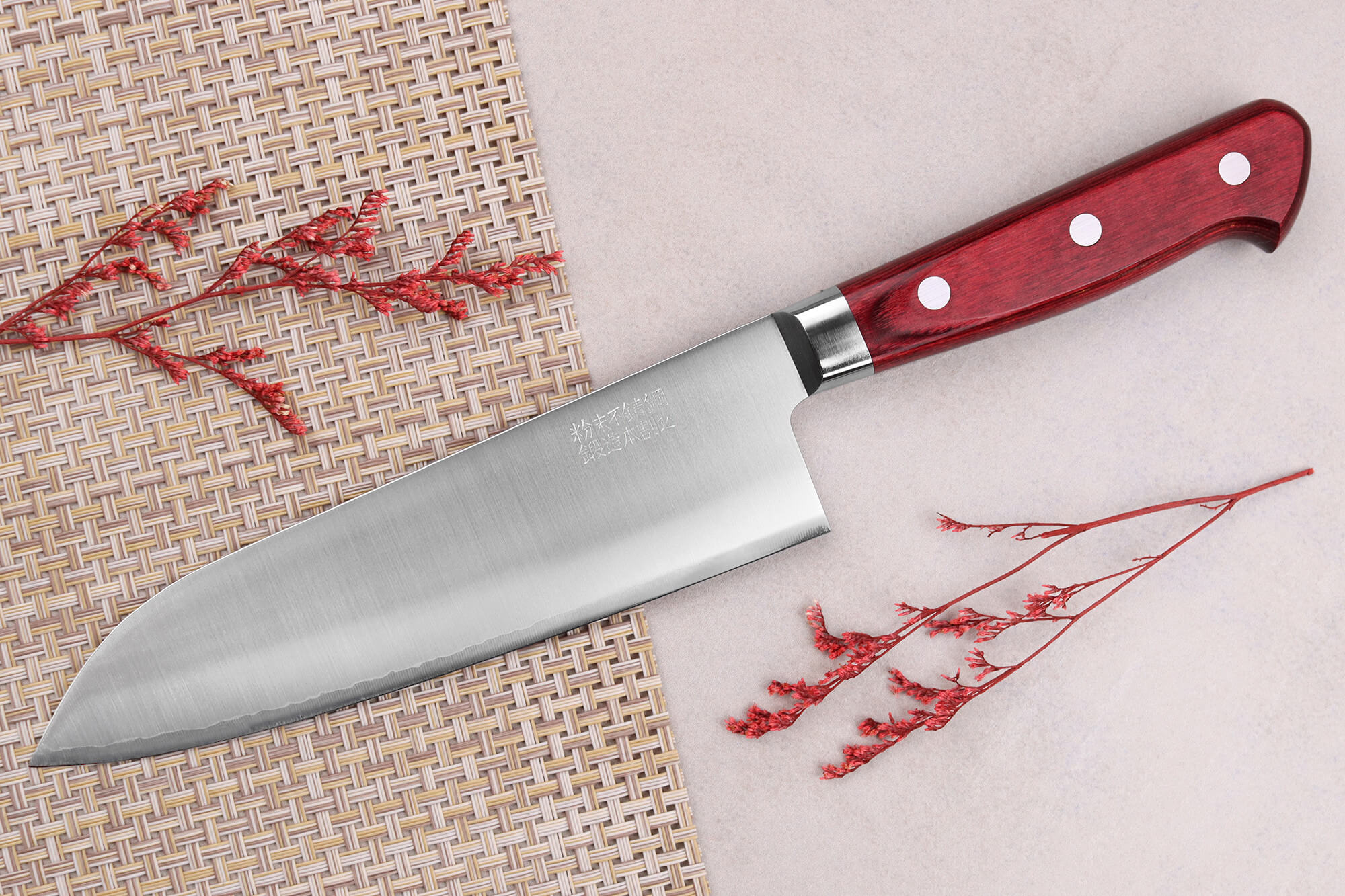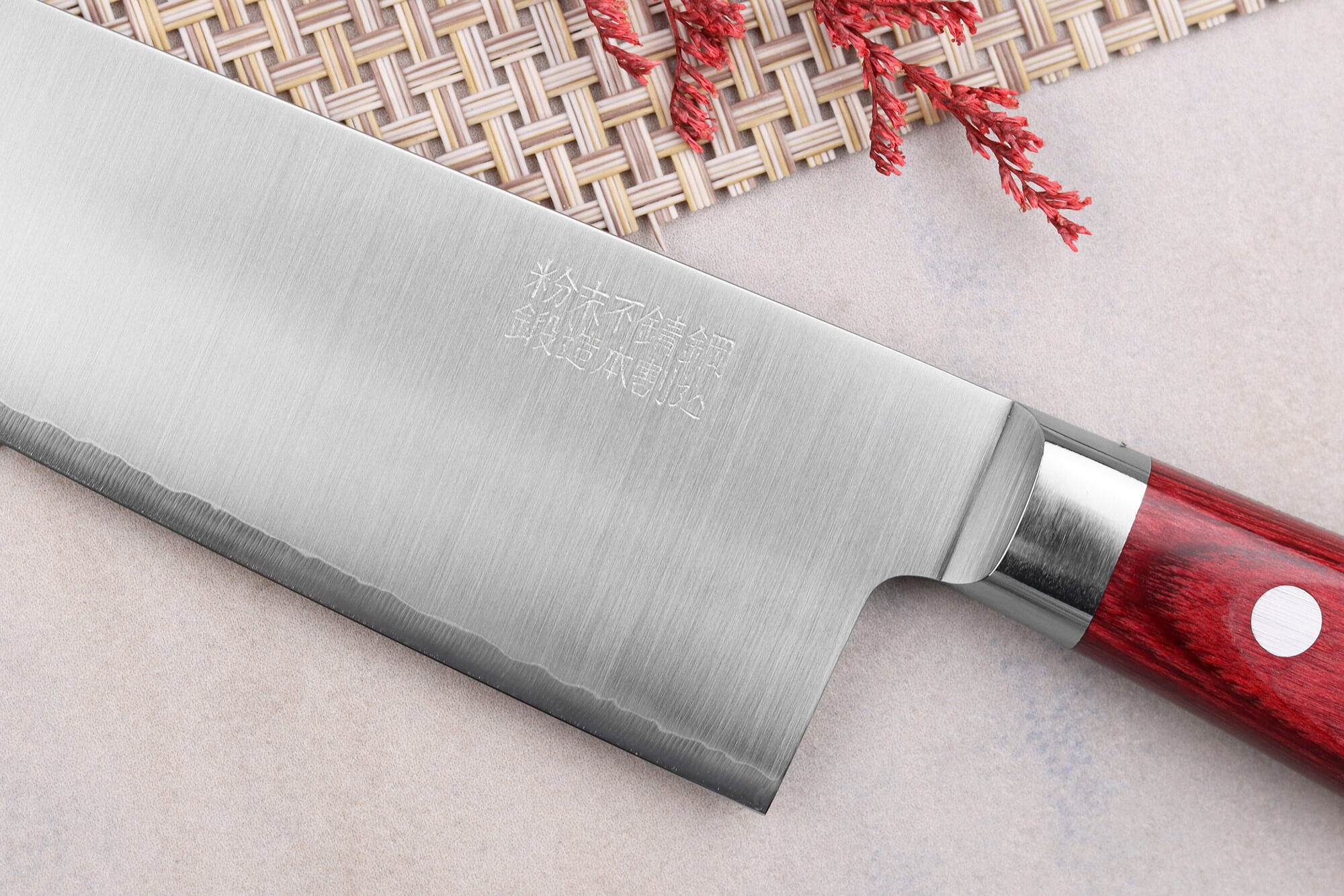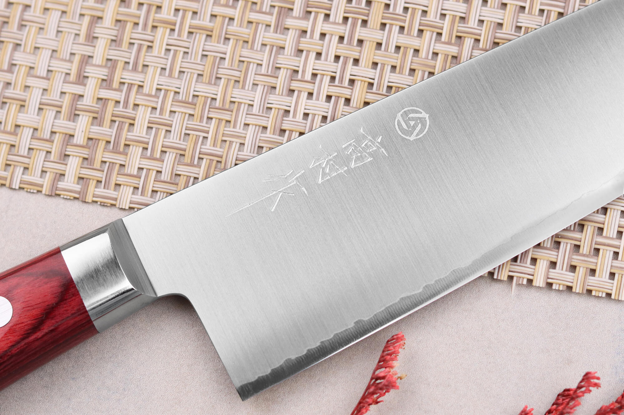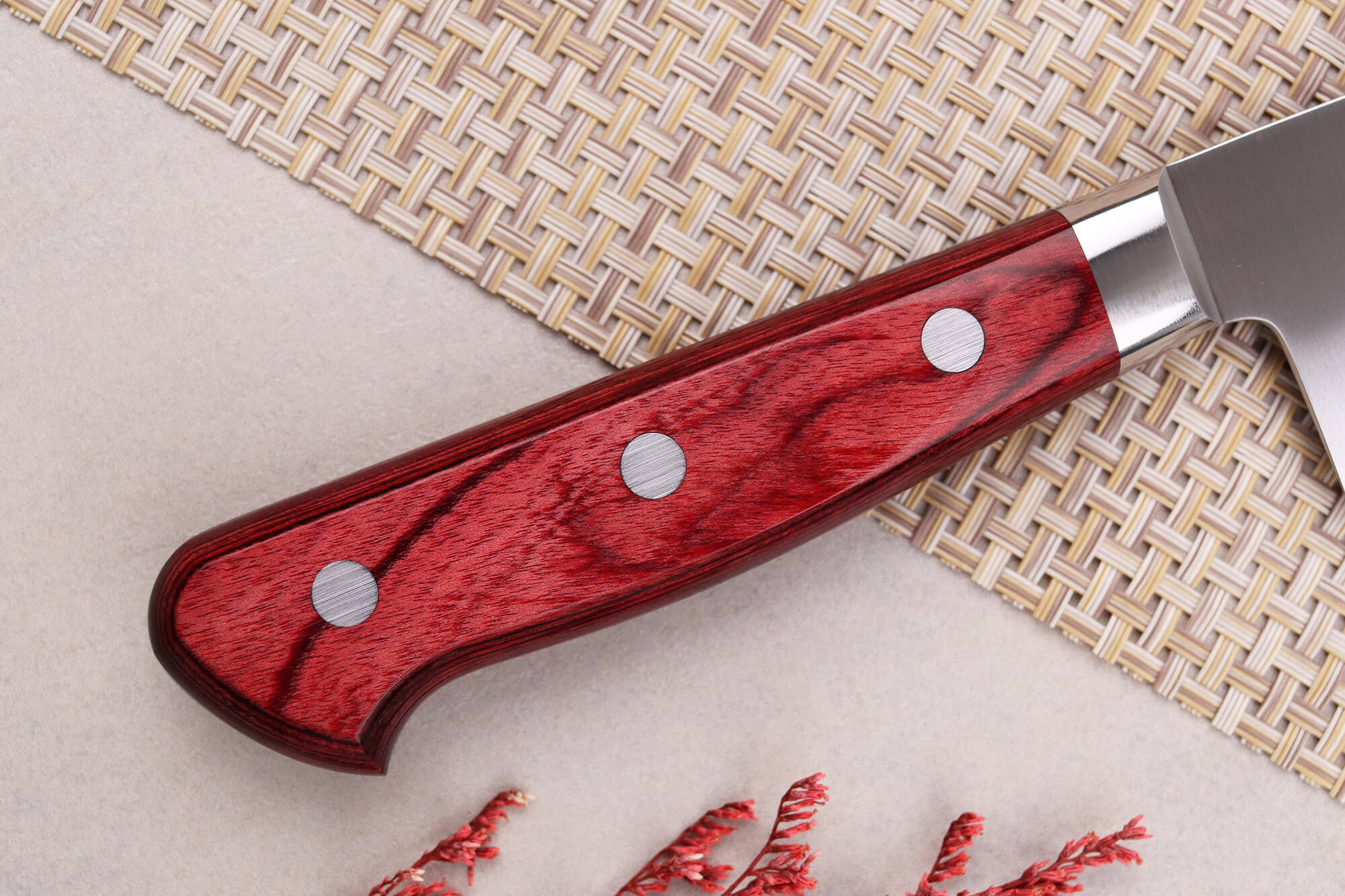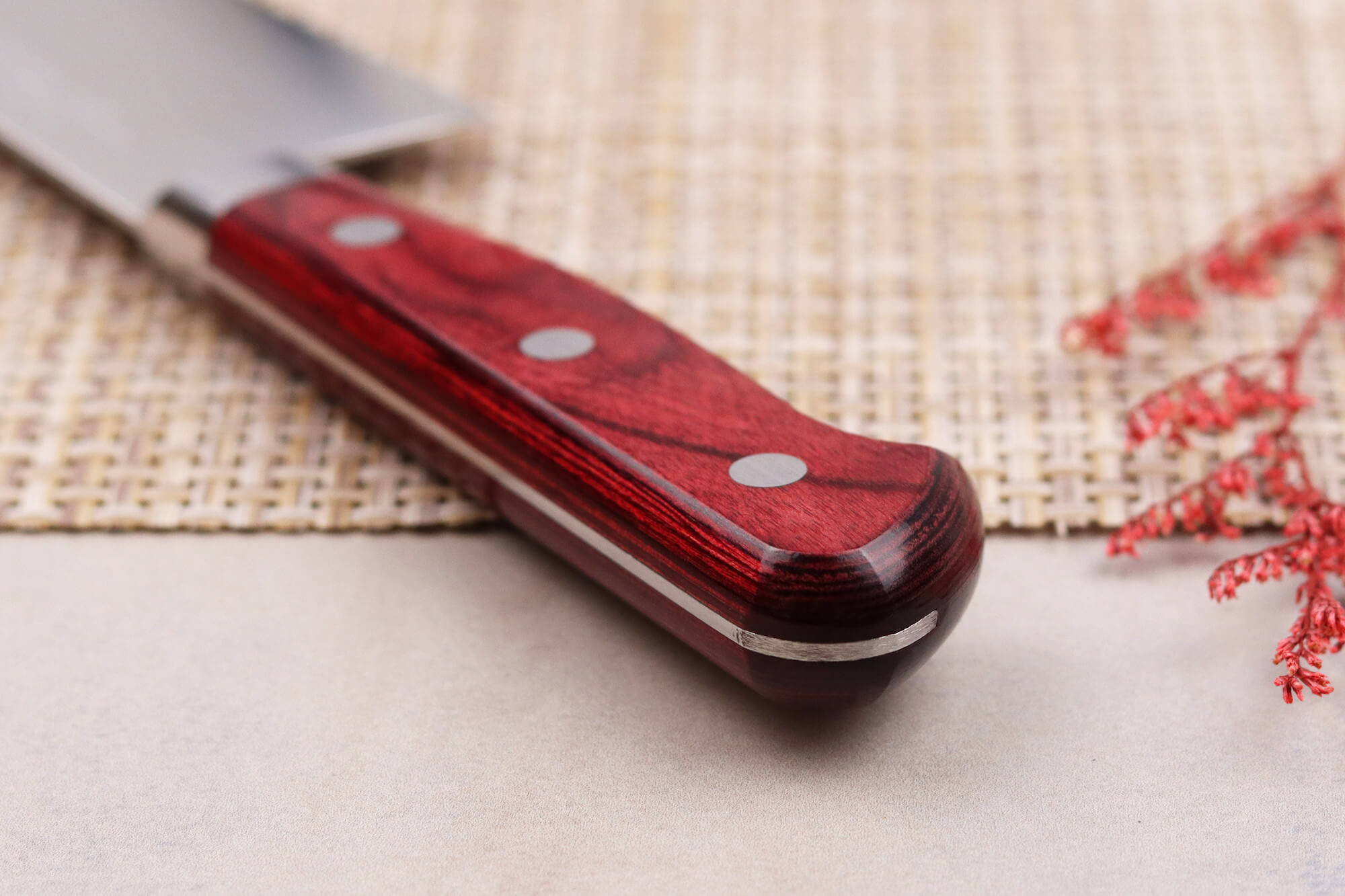 Le manche de ce couteau de cuisine japonais est en pakkawood aux nuances rouges. C'est un matériau composite réunissant des lamelles de bois compressées et de la résine, assemblés à chaud. Il a l'avantage d'être antibactérien, résistant aux différences de température et à l'humidité. Il est complété par 3 rivets qui viennent le maintenir en position stable.