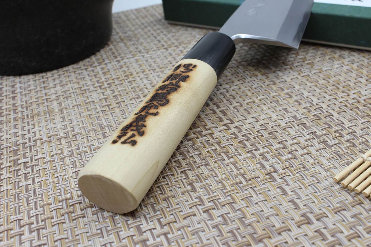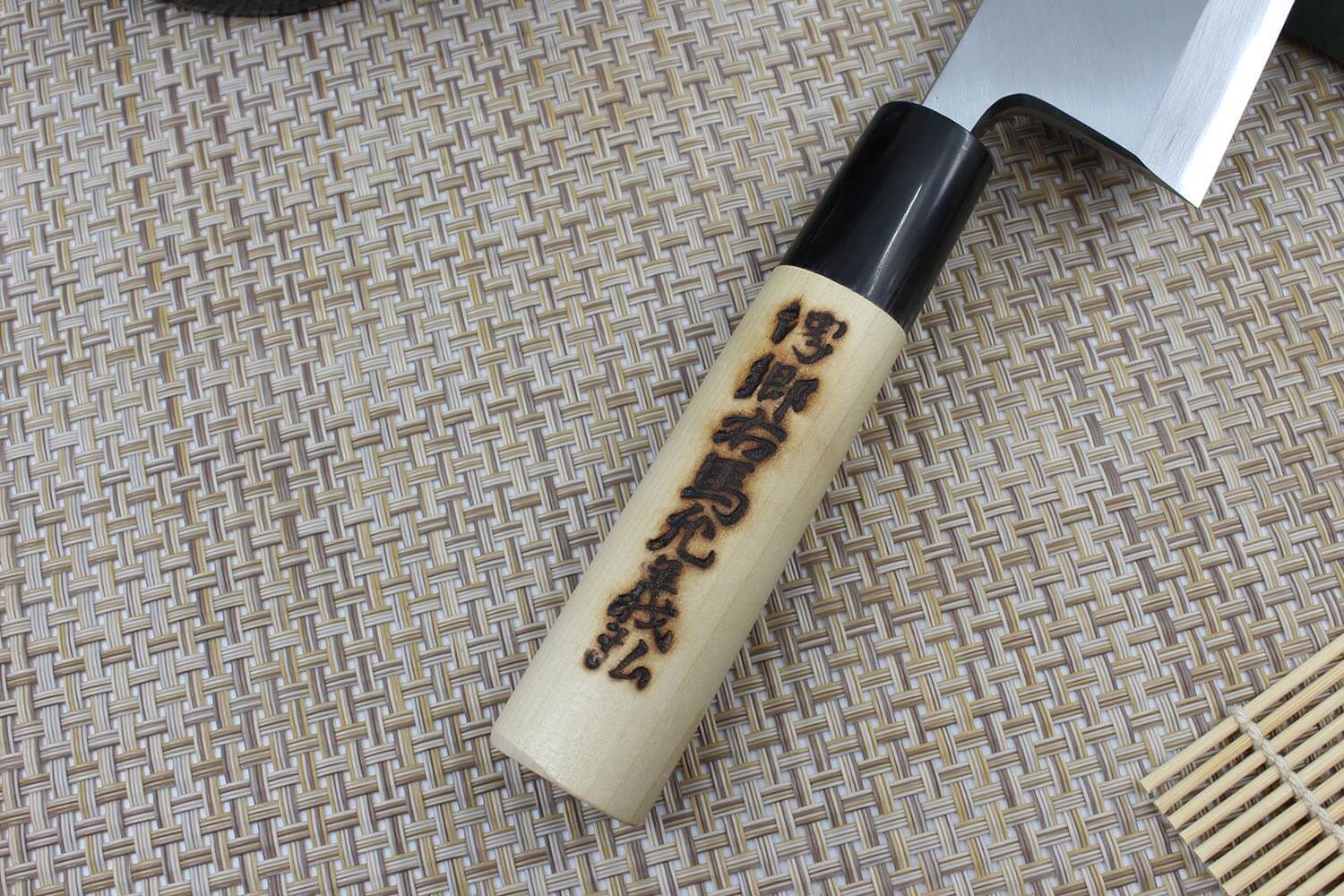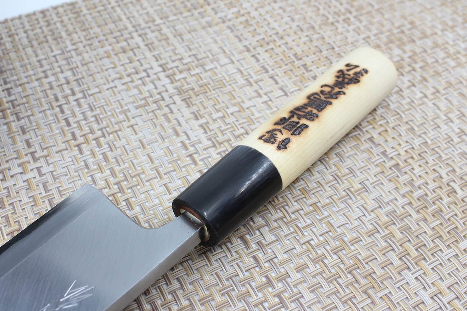 Une virole traditionnelle noire en corne de buffle vient faire le lien entre la lame et le manche. Elle présente généralement des marbrures naturelles uniques. L'espace entre la lame et le manche est rempli de pâte afin d'empêcher l'humidité et les aspérités de se loger dans cet espace. Le manche est fabriqué en bois de magnolia blanc. Sa forme en D traditionnelle est plus adaptée aux droitiers, mais procure une très bonne prise en main.