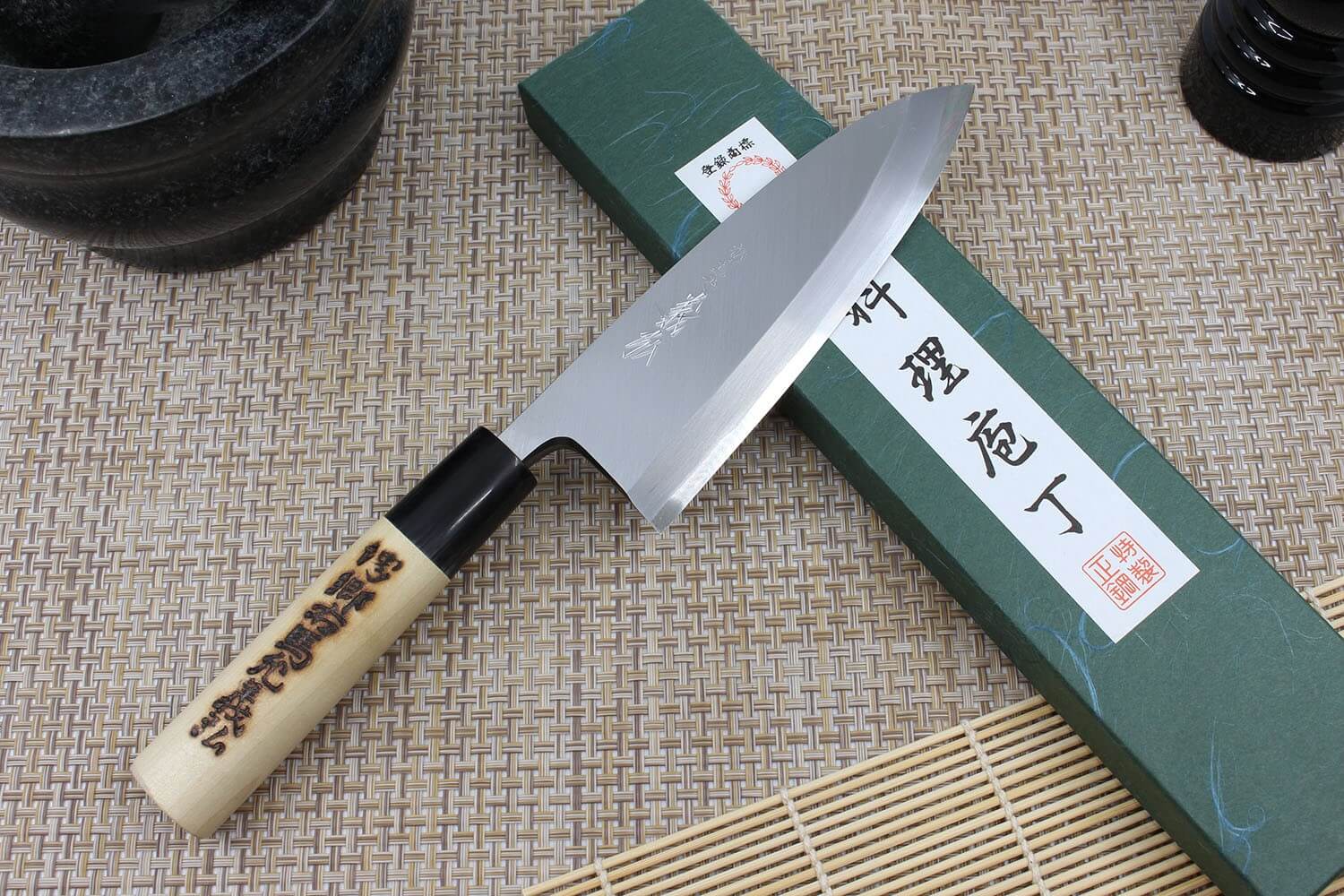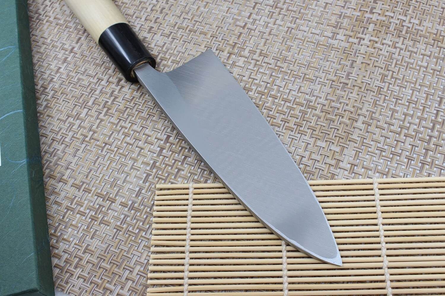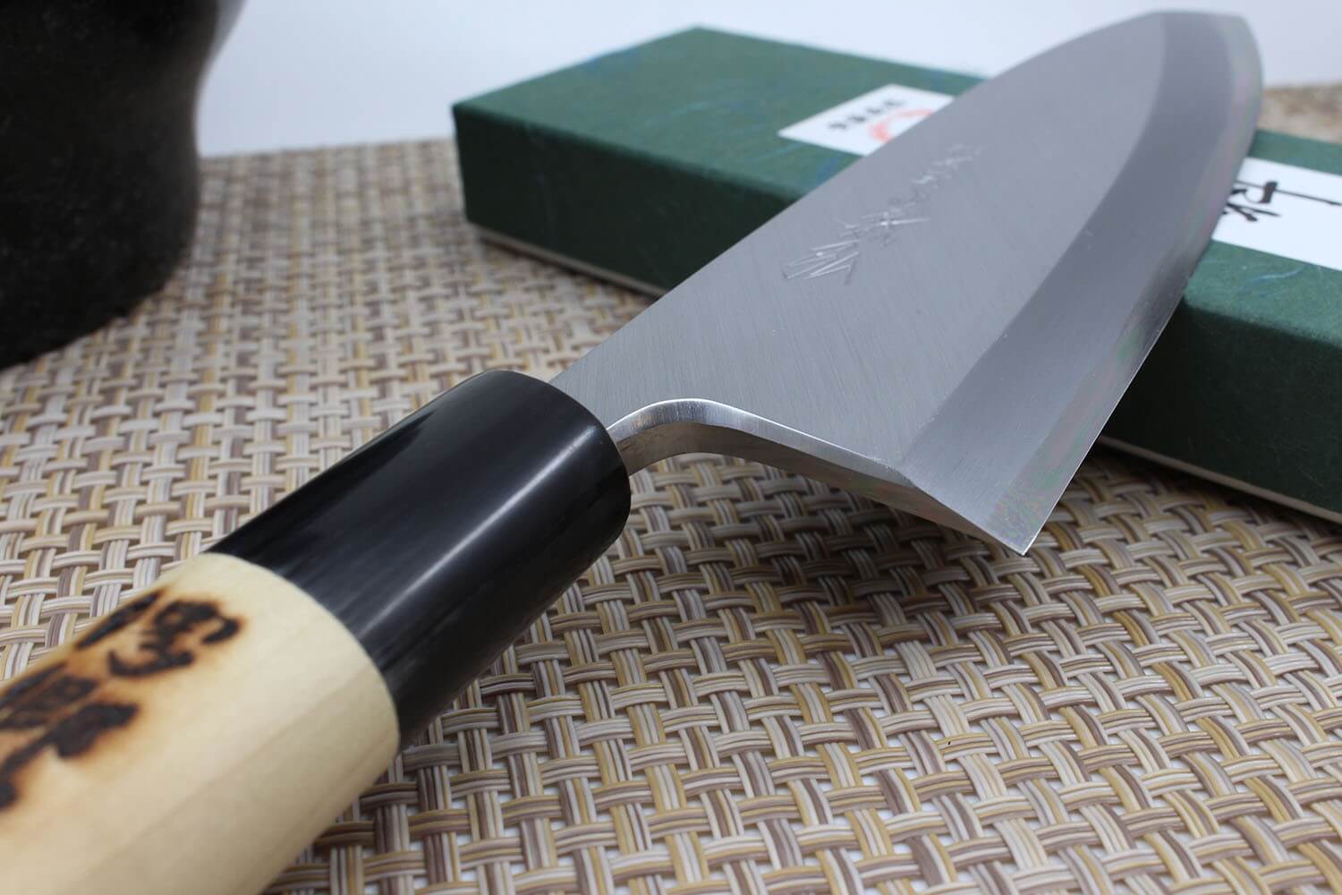 Une virole traditionnelle noire en corne de buffle vient faire le lien entre la lame et le manche. Elle présente généralement des marbrures naturelles uniques. L'espace entre la lame et le manche est rempli de pâte afin d'empêcher l'humidité et les aspérités de se loger dans cet espace. Le manche est fabriqué en bois de magnolia blanc. Sa forme en D traditionnelle est plus adaptée aux droitiers, mais procure une très bonne prise en main.