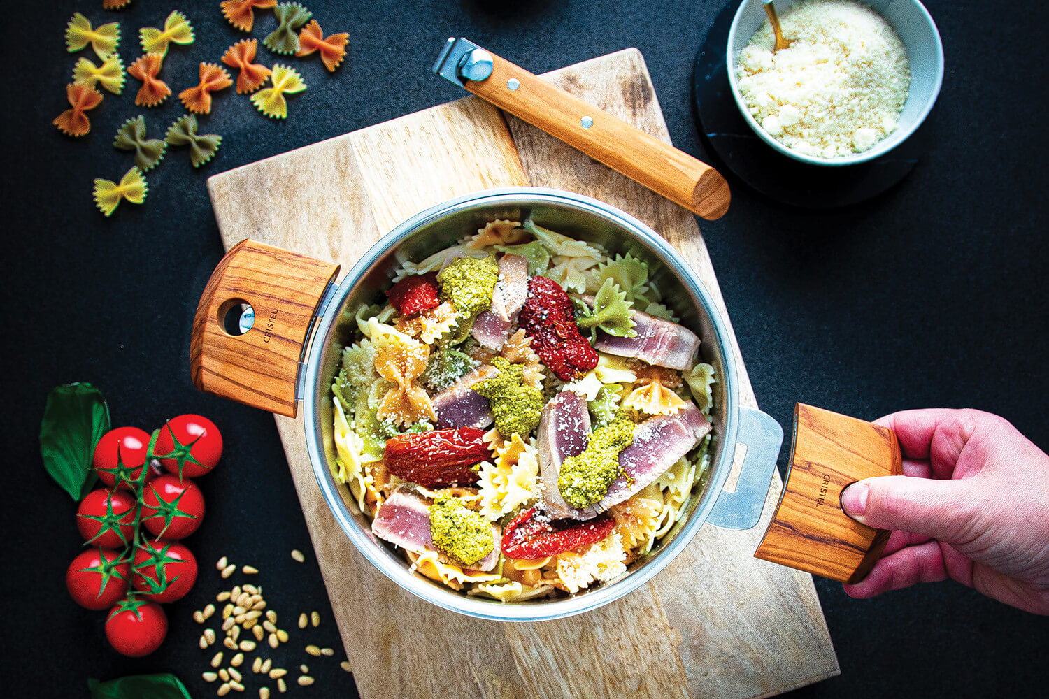 Le rebord verseur large facilite le service sans gouttes ni éclaboussures, et la casserole peut être utilisée avec des poignées ou anses amovibles Cristel (vendues séparément).