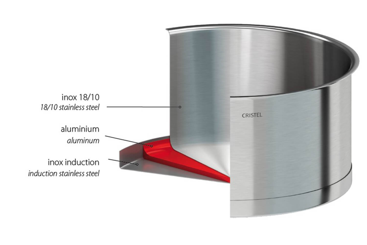 Le faitout Cristel a un fond rapporté thermodiffuseur en forme de L enveloppant. Il se compose de :