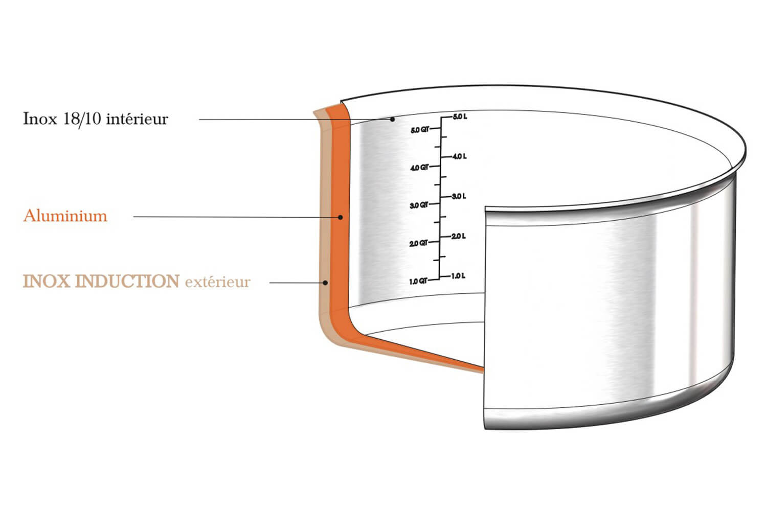 Cette sauteuse Alchimy vous garantit d'excellentes performances de cuisson grâce à sa conception multicouches. Elle vous permet de maîtriser toutes les cuissons, même si elles sont délicates. Voici le détail des 3 couches :