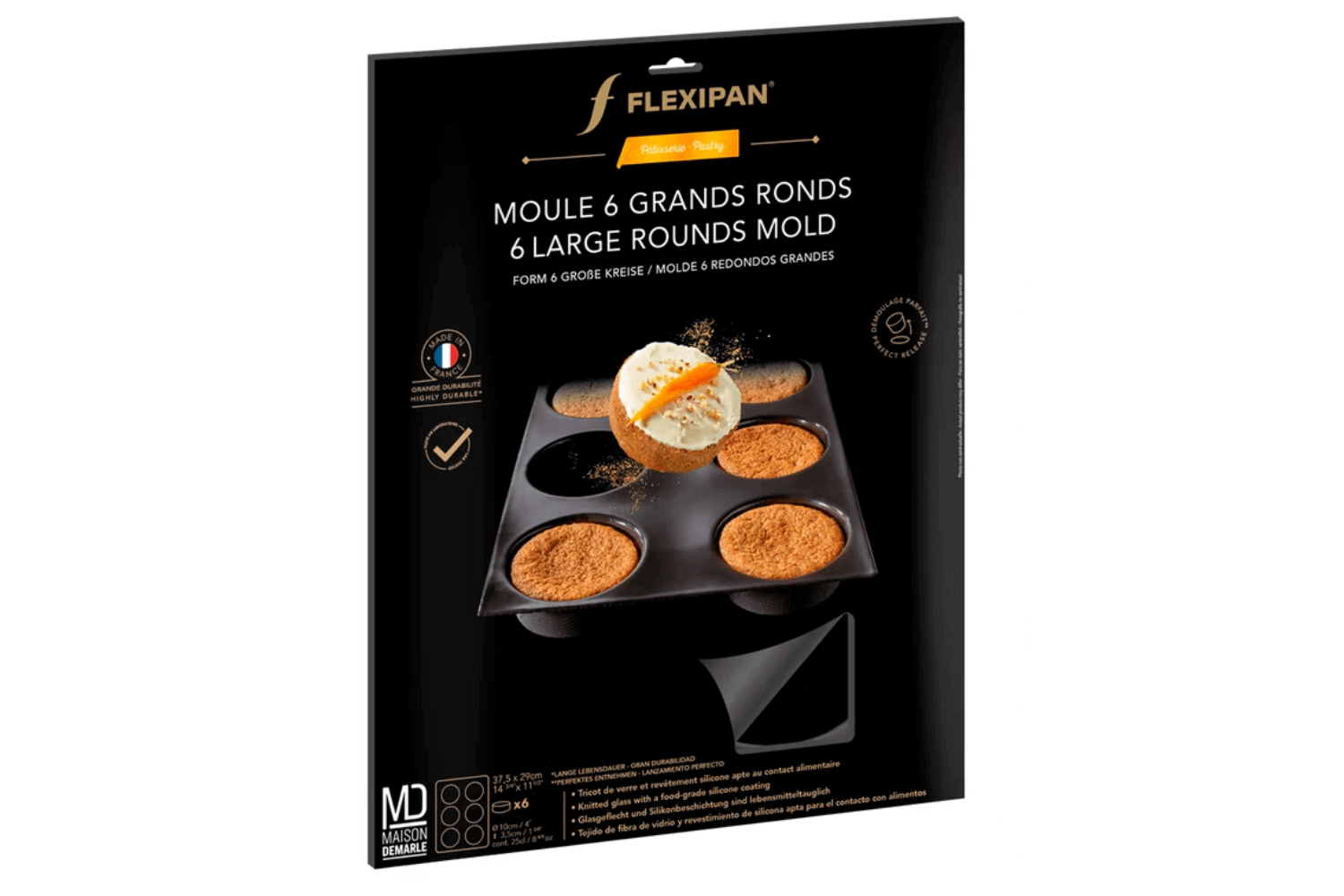 Qu'il s'agisse de tartelettes, de muffins, ou encore de mini-pizzas, le moule 6 grands ronds Flexipan vous aide à réaliser vos recettes sucrées ou salées préférées. Ses 6 empreintes ont, chacun, un diamètre de 10cm et une hauteur de 3,5cm. Vous aurez donc le plaisir de créer 6 parts généreuses pour régaler toute la famille !