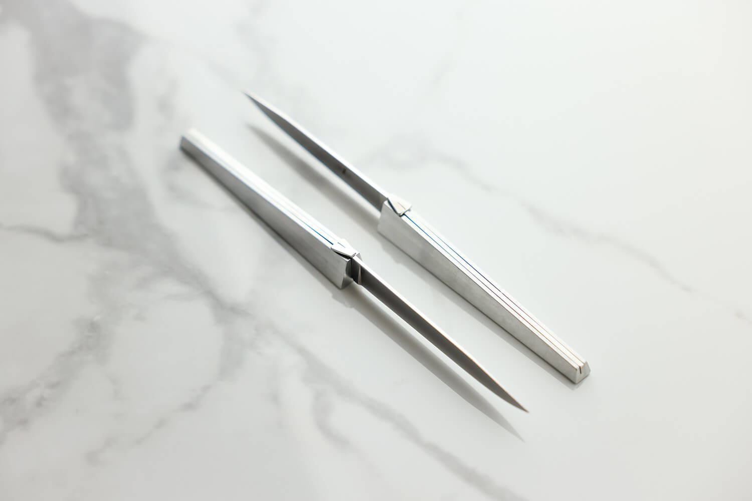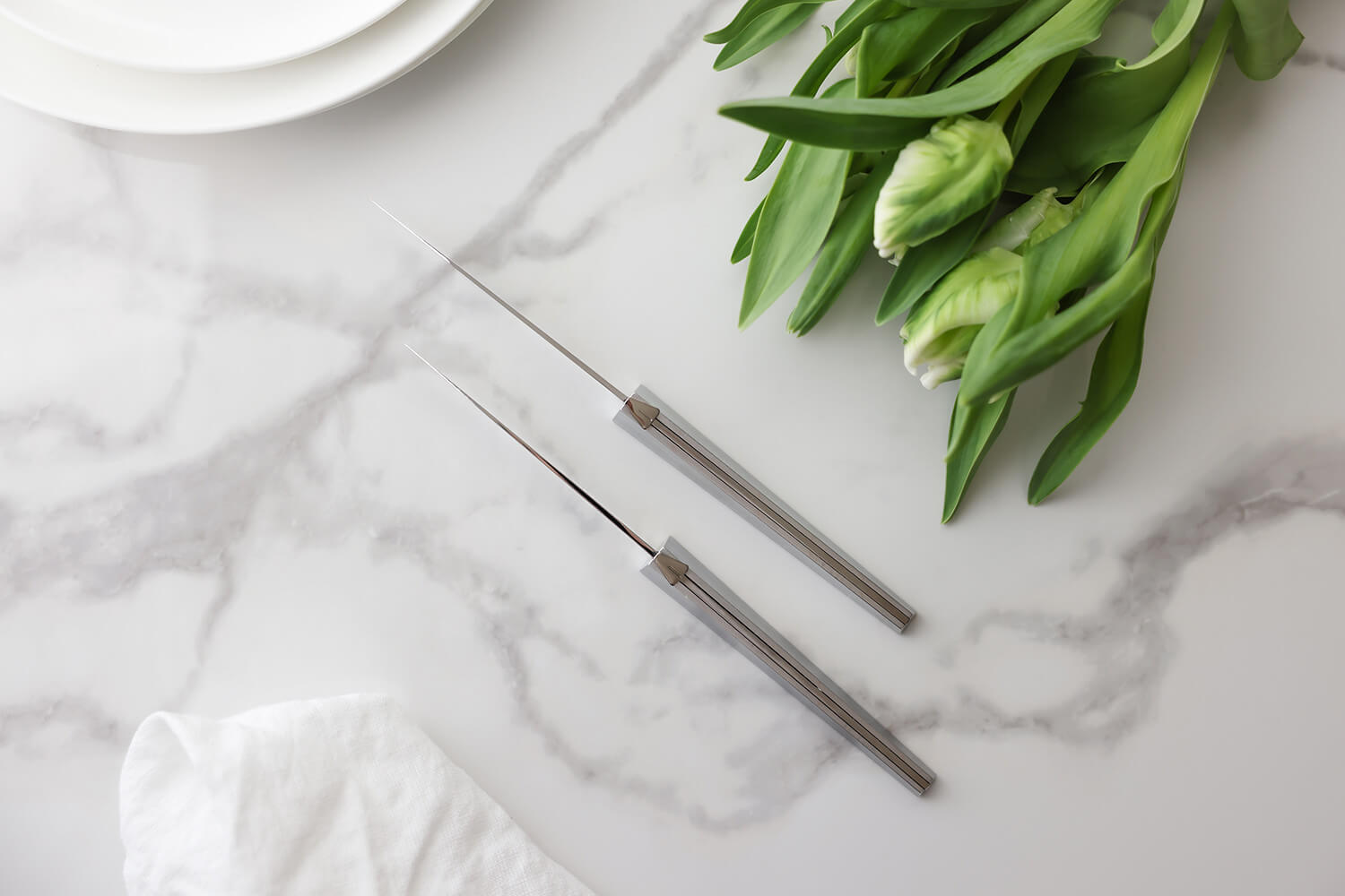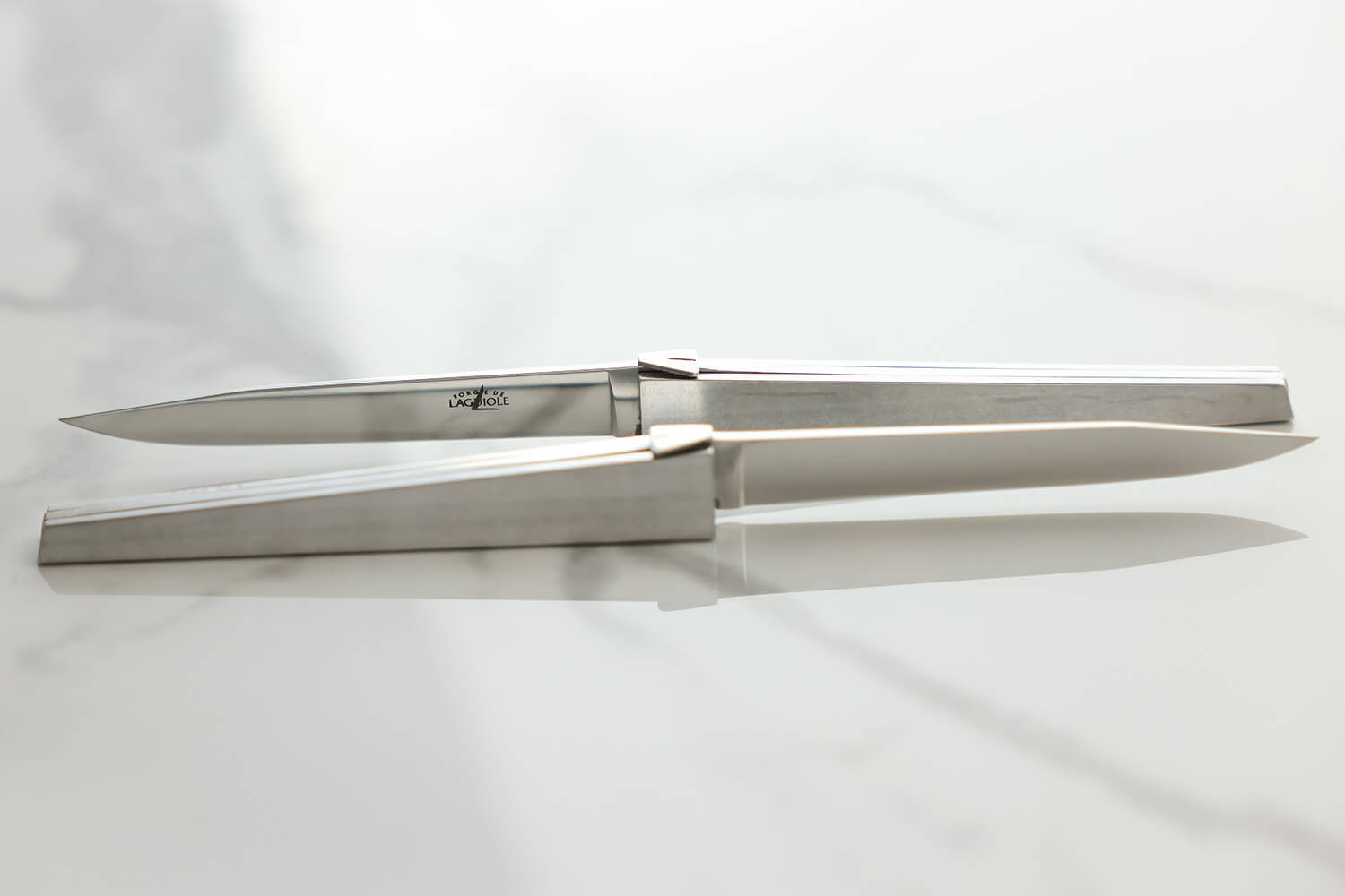 Concernant le manche des couteaux, il est fait en aluminium plein, une matière légère et robuste. Son choix n'est pas anodin, car il symbolise à la fois la pureté et la tradition des arts de la table.