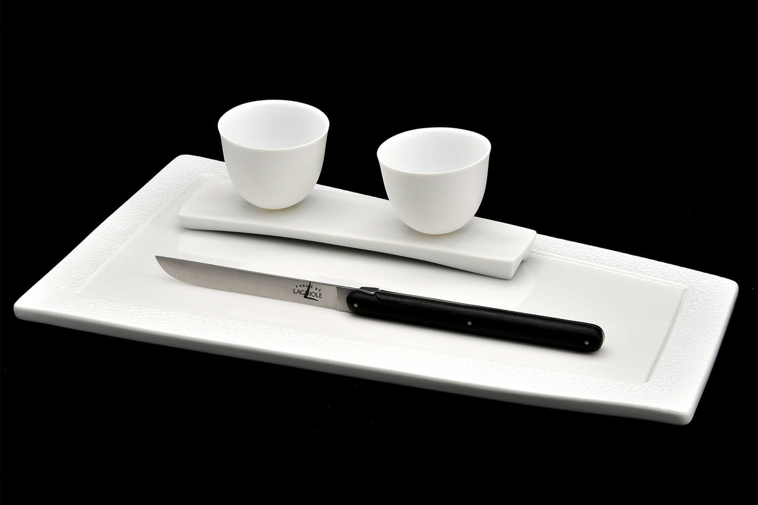 Andrée Putman a conféré aux couteaux de table de ce coffret un style épuré élégant. Les lignes droites utilisées sont terminées par des arrondis qui permettent de leur apporter de la douceur. La lame des couteaux se termine par une pointe centrée, faisant écho aux couteaux pliants de l'Aubrac, région de Laguiole, des années 1800. On parle d'ailleurs de lame bourbonnaise.