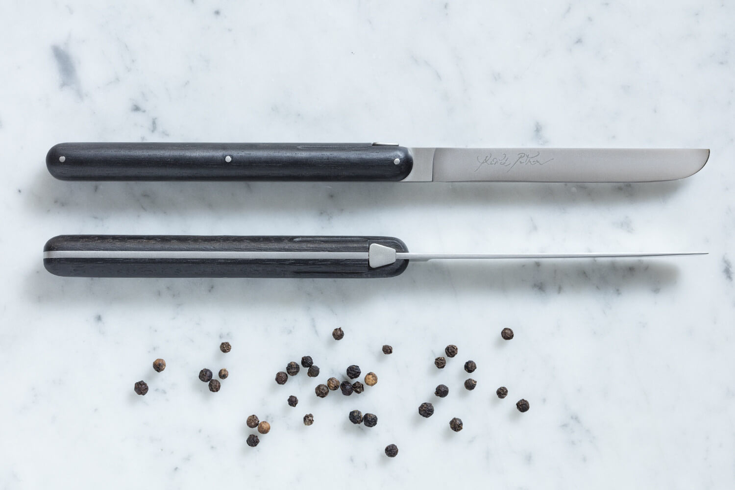 Le manche des couteaux est pour sa part fabriqué en ébène, un bois précieux reconnaissable par sa teinte profonde presque noire. 3 petits rivets viennent solidement fixer les plaquettes de bois à la soie des couteaux. Mesurant au total 23,5cm de long, ces couteaux fins vous assurent une décoration de table à la fois simple et raffinée.