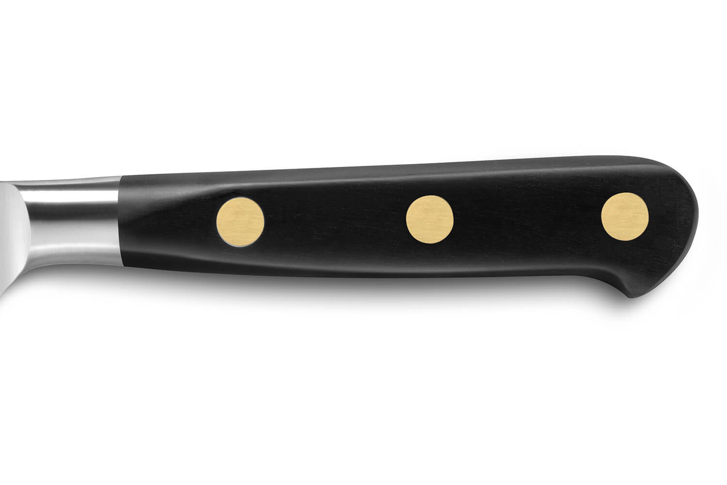 Le manche en POM noir, un polymère ultra-résistant, assure une excellente prise en main et une durabilité à toute épreuve. Son maintien est renforcé par trois rivets en laiton traversants, emblèmes de cette collection phare Sabatier.