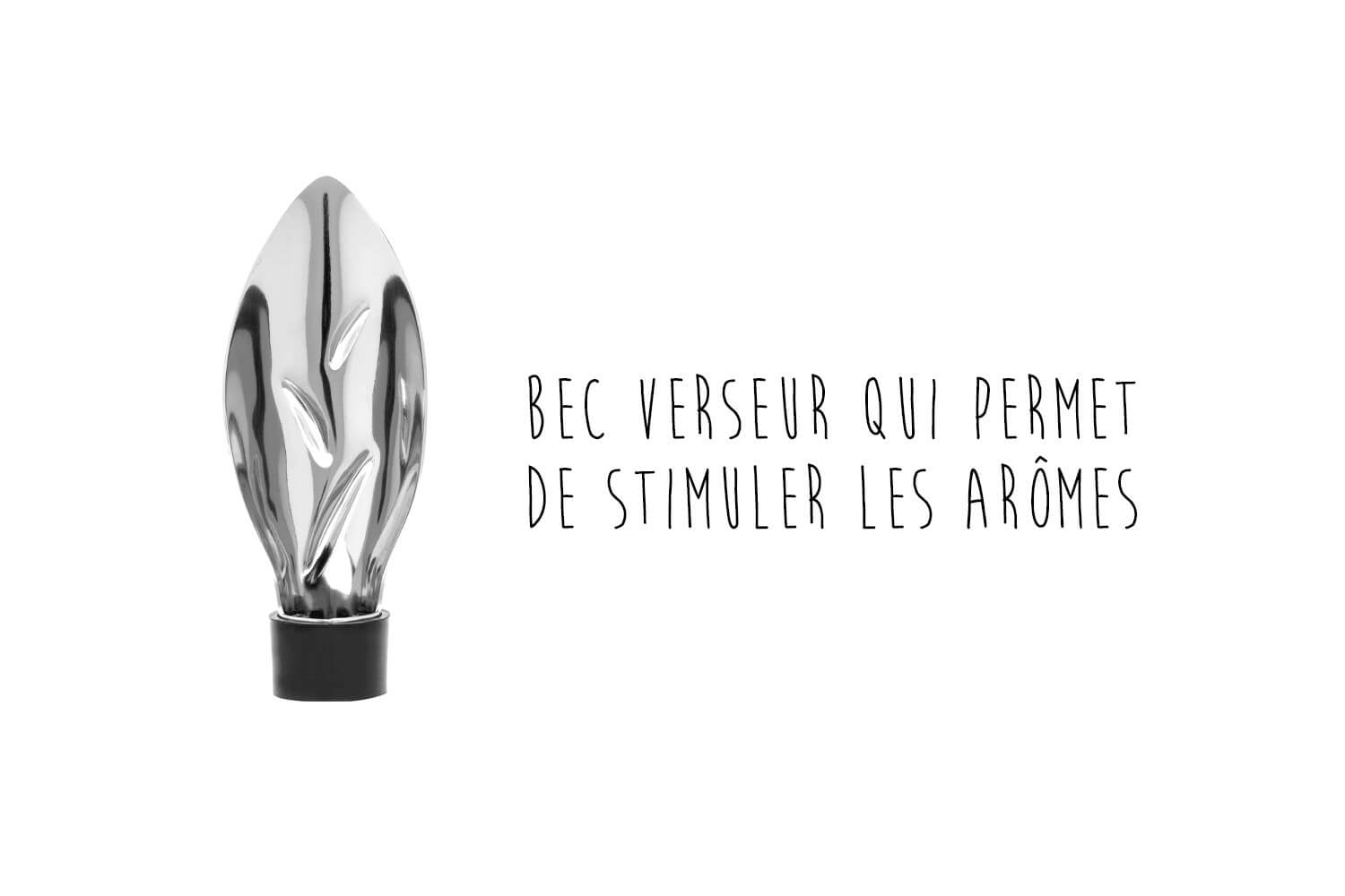 - 1 bec verseur qui permet également de stimuler les arômes du vin. C'est un verseur ouvert en forme de feuille nervurée. Son entretien en est facilité (passez-le sous l'eau tiède entre chaque usage, sans le frotter).