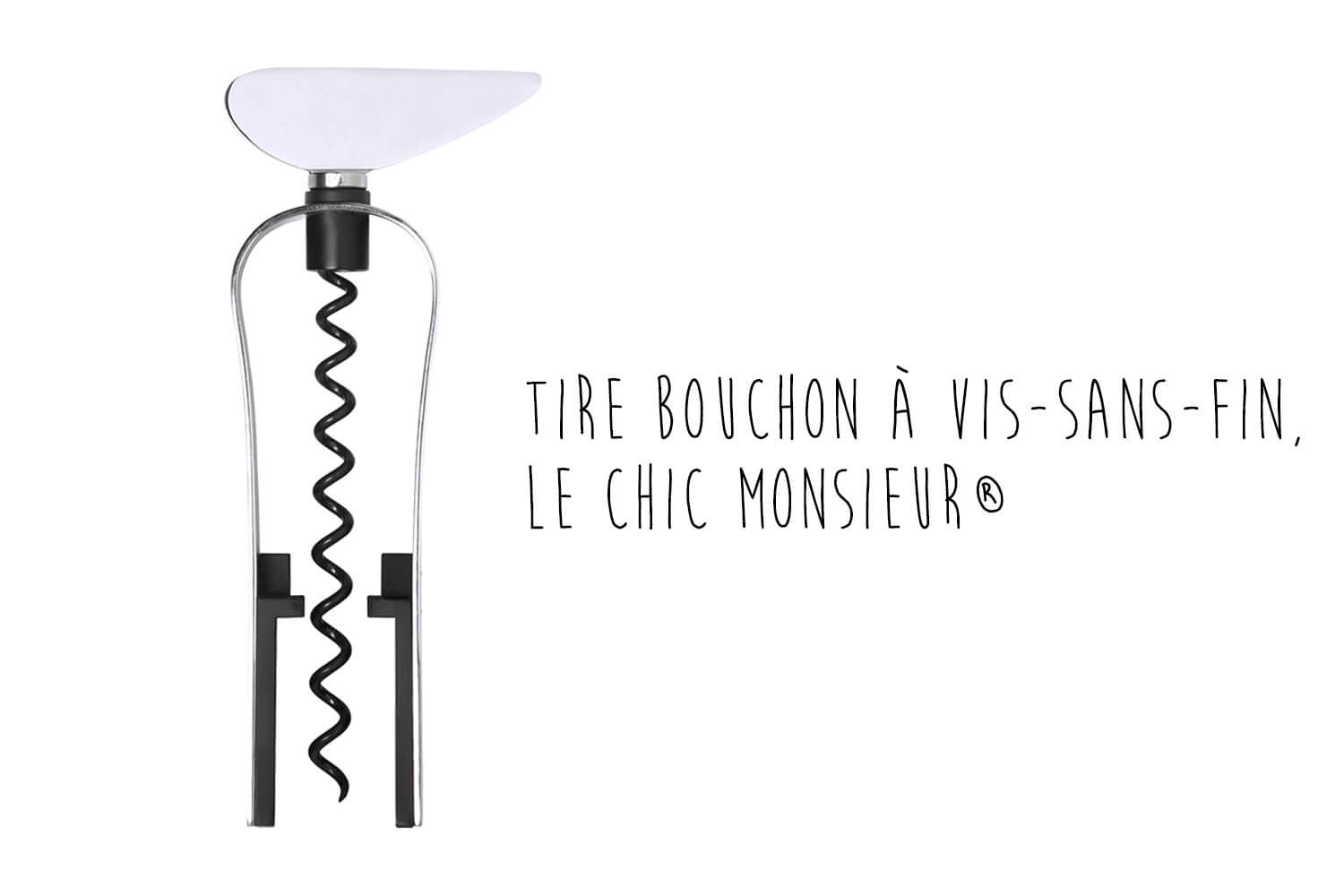 - 1 tire bouchon à vis-sans-fin, le Chic Monsieur® : simple mais efficace, ce petit tire-bouchon à fines bandes en métal est équipée d'une tête facile à prendre en main. Son ossature révélée lui donne un côté très design !