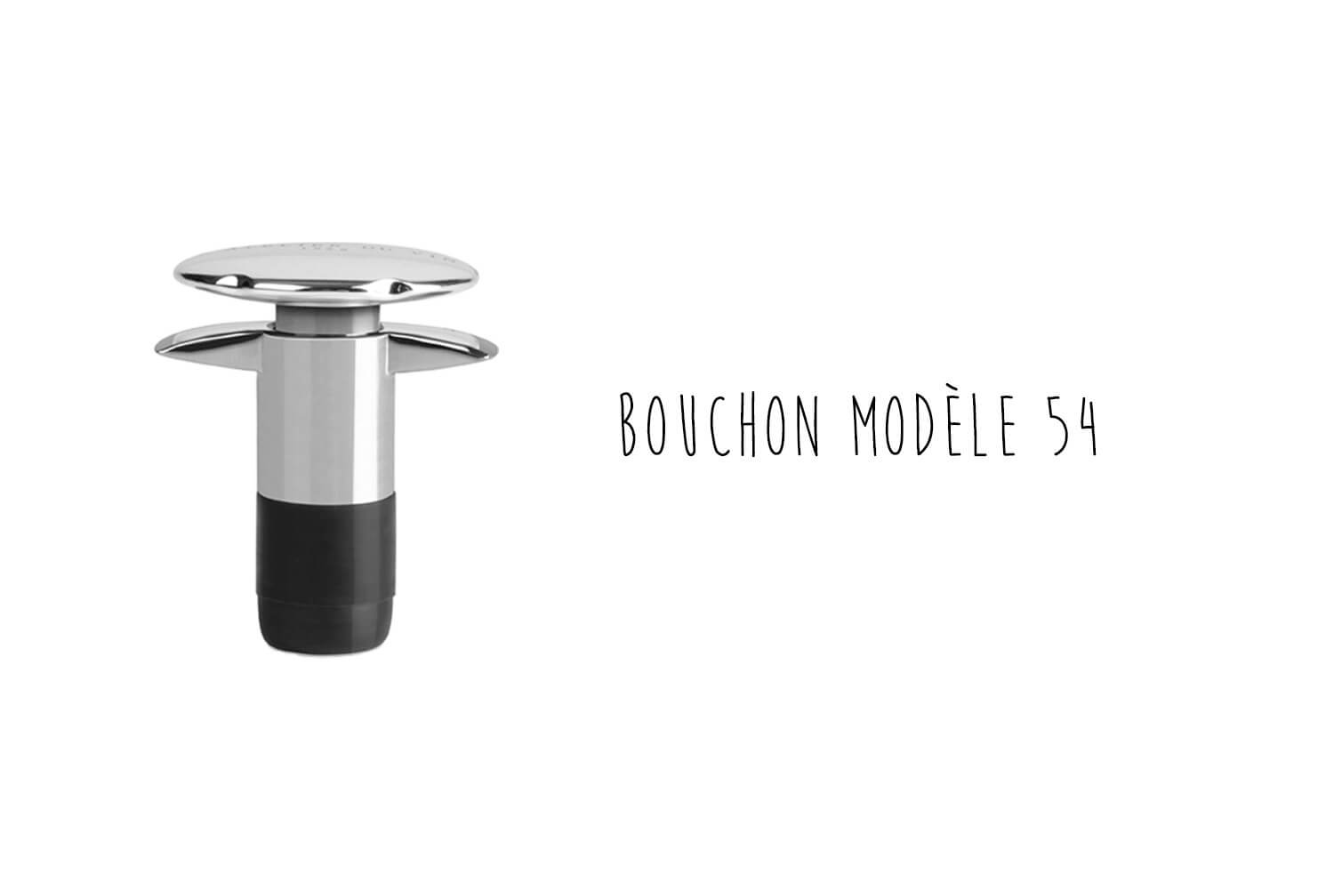 - 1 bouchon à champagne Modèle 54 qui fonctionne aussi sur les vins pétillants. Pour l'utiliser, il faut mettre la partie inférieure du bouchon dans le goulot de votre bouteille, puis il faut visser la partie circulaire supérieure. Lorsque vous voulez le retirer, maintenez les 2 ailettes pour dévisser la partie circulaire.