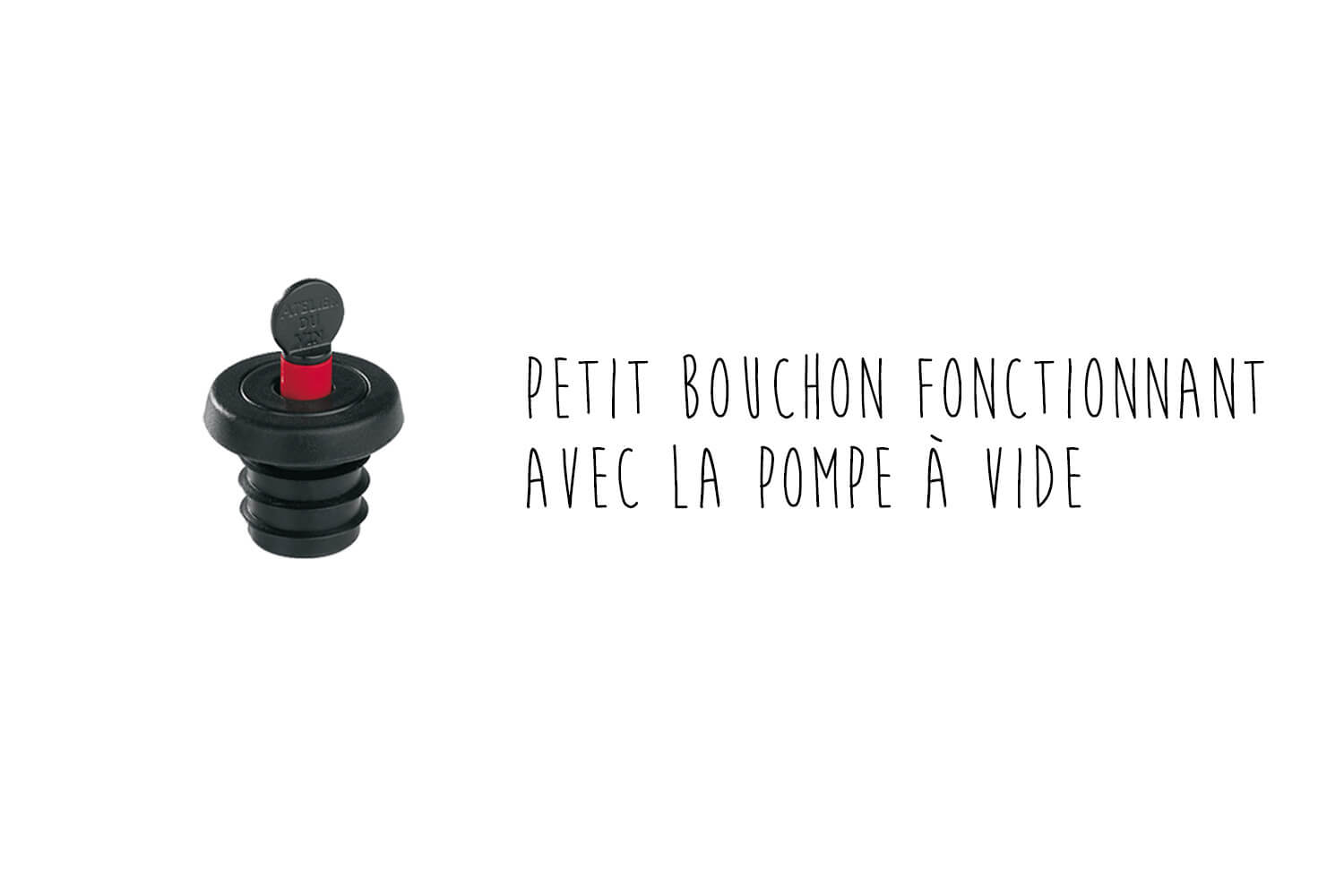 - 1 petit bouchon noir fonctionnant avec la pompe à vide pour garder l'air en dehors de la bouteille : son anneau témoin vous indique si l'air est encore présent. S'il est visible, c'est qu'il y en a ! Une fois que vous aurez utilisé la pompe à vide, il disparaît pour indiquer que la bouteille est vide d'air et scellée.