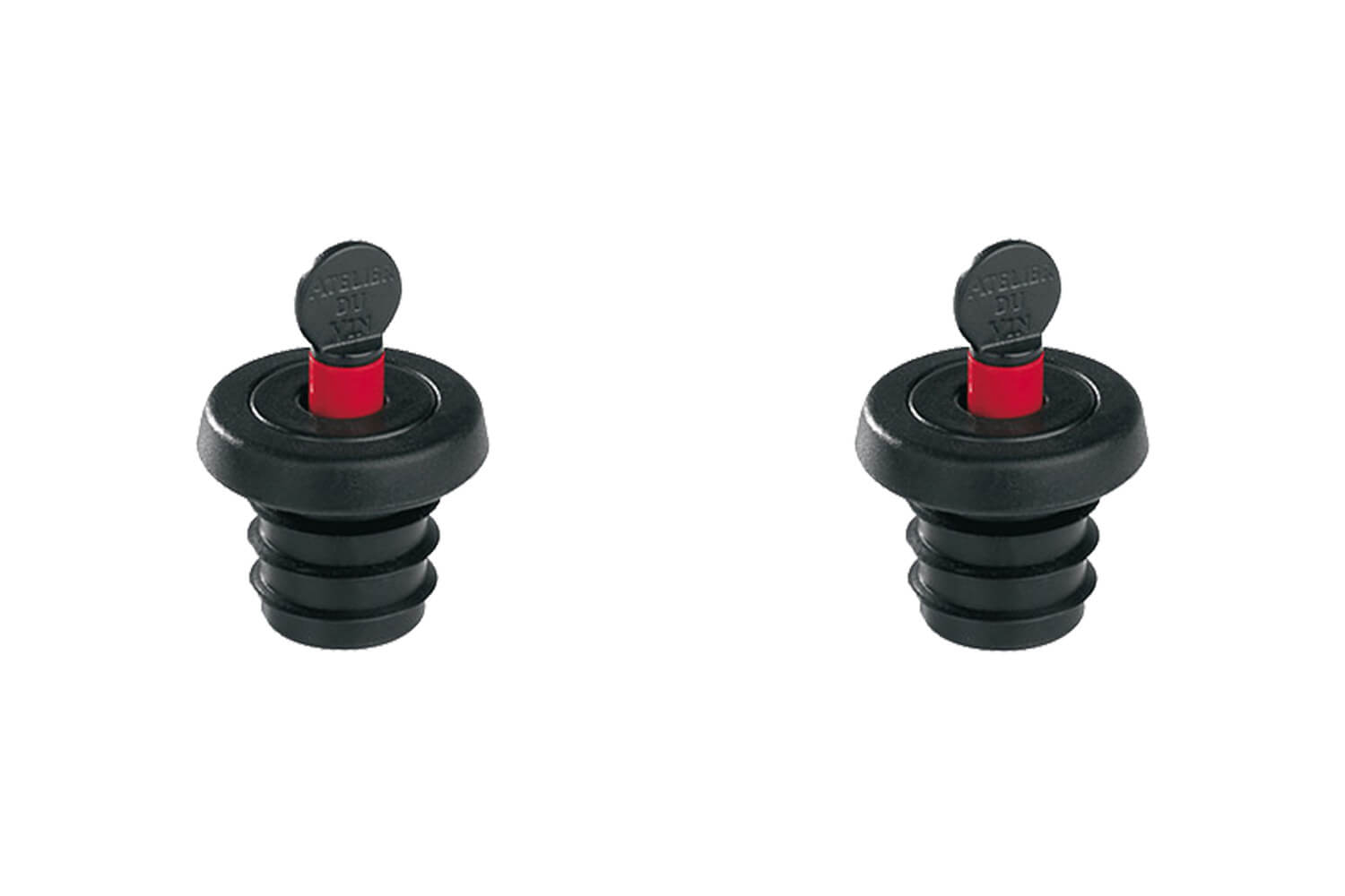 - 2 bouchons indicateurs Gard'Vin ON/OFF noirs. Ces bouchons parfaitement étanches s'utilisent exclusivement avec la pompe à vide pour ôter l'air de la bouteille de vin. Le goût n'est pas altéré. L'indicateur coloré disparaît pour vous indiquer que l'air est totalement extrait de la bouteille. Au nombre de 2, vous pouvez ouvrir plusieurs vins simultanément.
