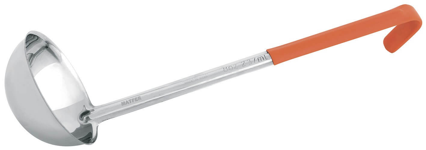 Le manche dispose d'une extrémité fabriquée en PVC orange, pour lui attribuer une fonction précise et éviter les contaminations croisées. Choisissez donc cette louche Matfer pour un travail performant au quotidien, en restauration, ou à la maison.