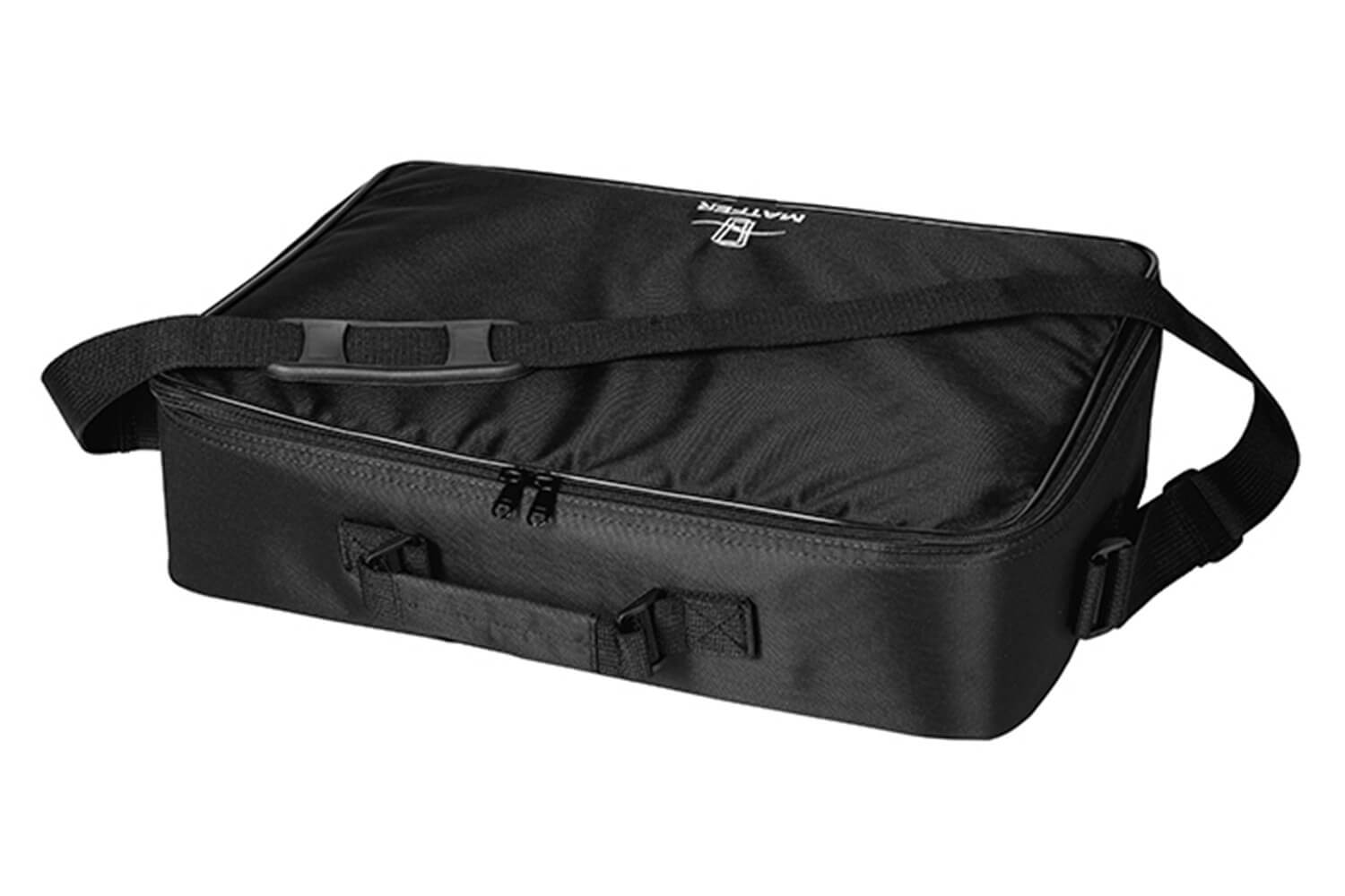 La mallette est fabriquée en nylon noir, elle présente une haute résistance à l'usure tout en étant facile à nettoyer à l'aide d'une éponge. Elle se ferme à l'aide d'une double fermeture éclair et est équipée d'une bandoulière ajustable et d'une poignée pour faciliter son transport.