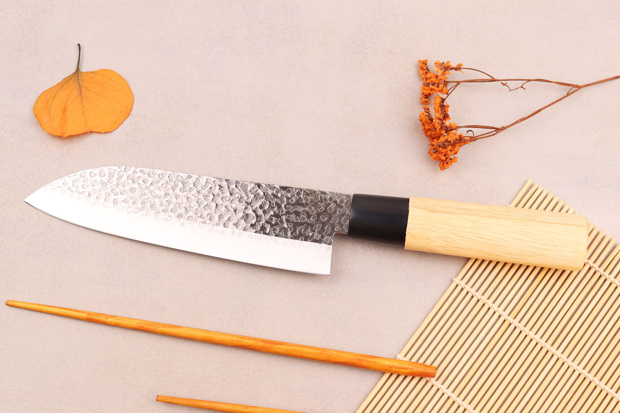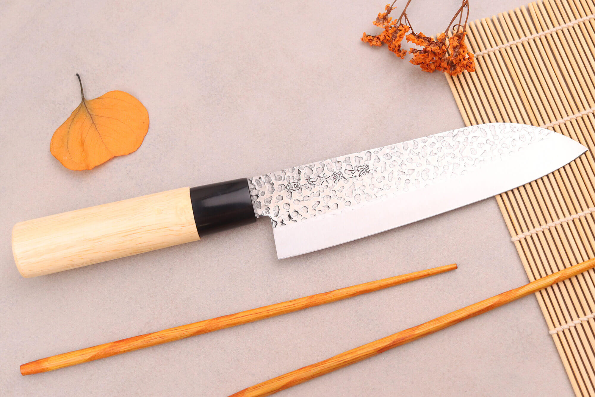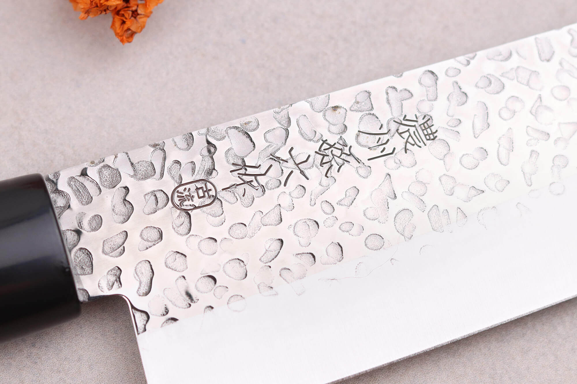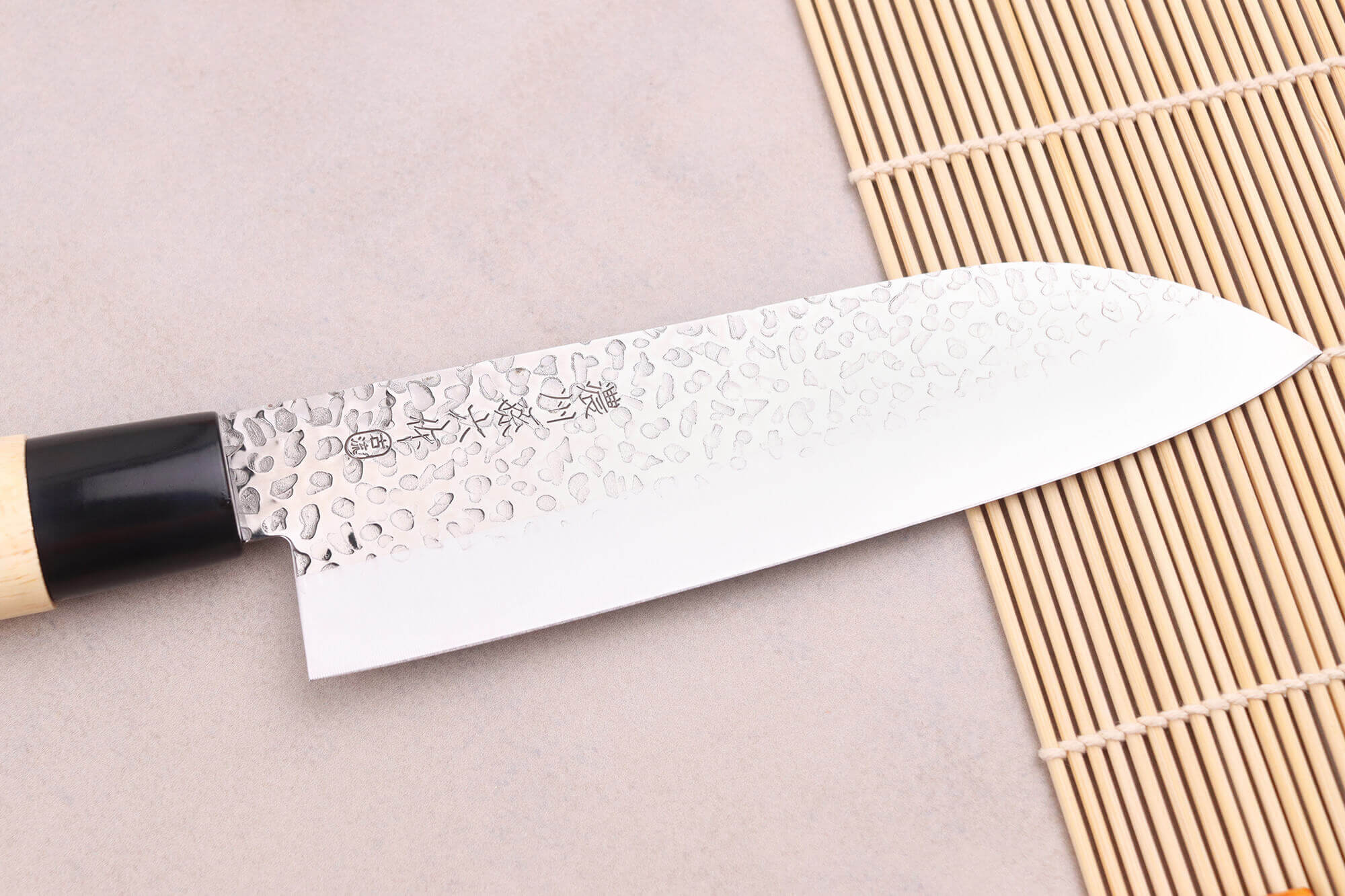 Ces couteaux ont été pré-aiguisés au laser pour une utilisation immédiate dès leur réception. La partie supérieure des lames possède une finition martelée, appelée Tsuchime, qui réduit l'adhérence des aliments humides ou gras. Le bas des lames a été poli et elles comportent des kanji, alliant ainsi élégance et authenticité.