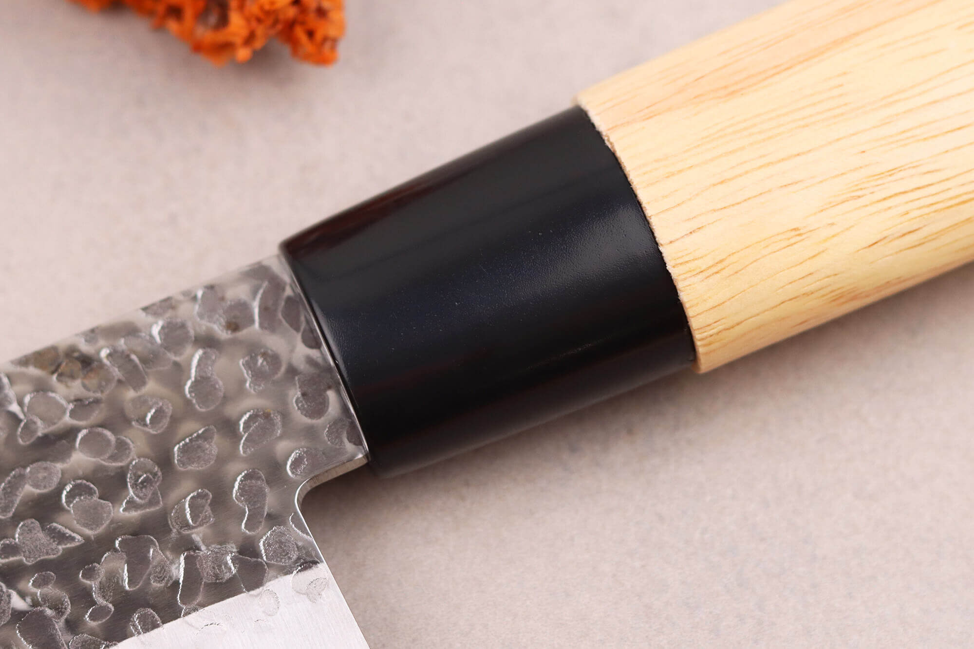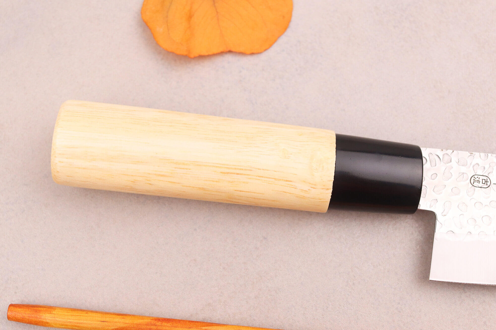 Le manche des couteaux est fabriqué en bois de magnolia, une essence précieuse caractérisée par sa teinte claire, proche du crème. Utilisé traditionnellement pour les fourreaux de sabres japonais, le magnolia est apprécié pour sa légèreté, sa douceur au toucher et sa résistance à l'humidité.